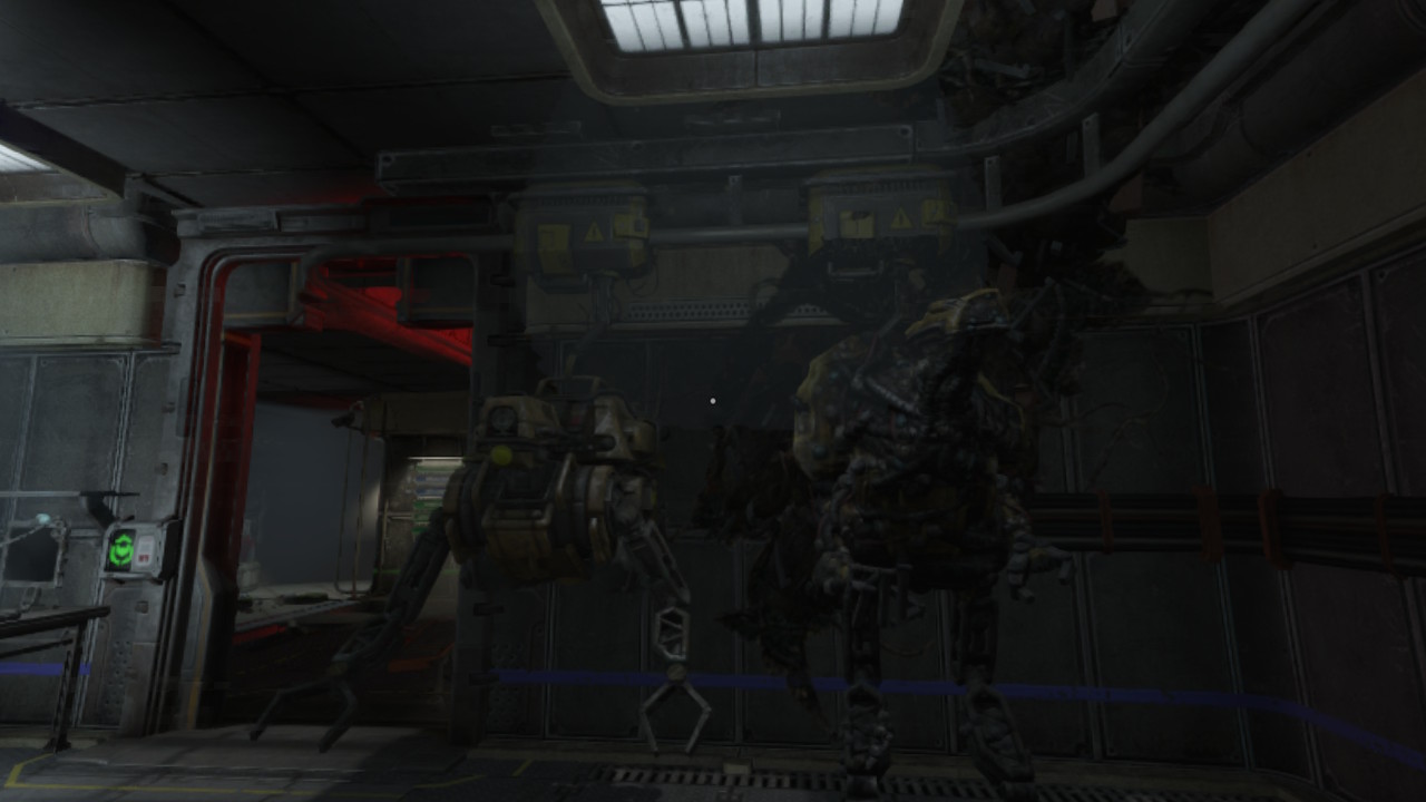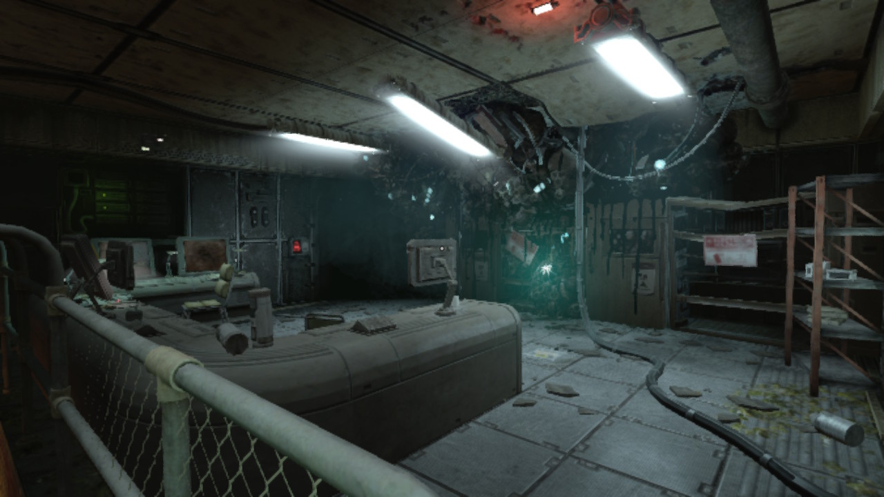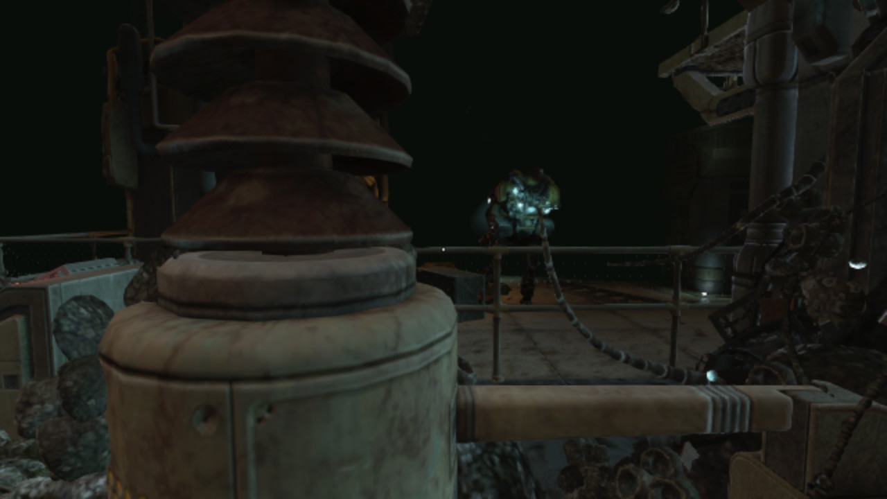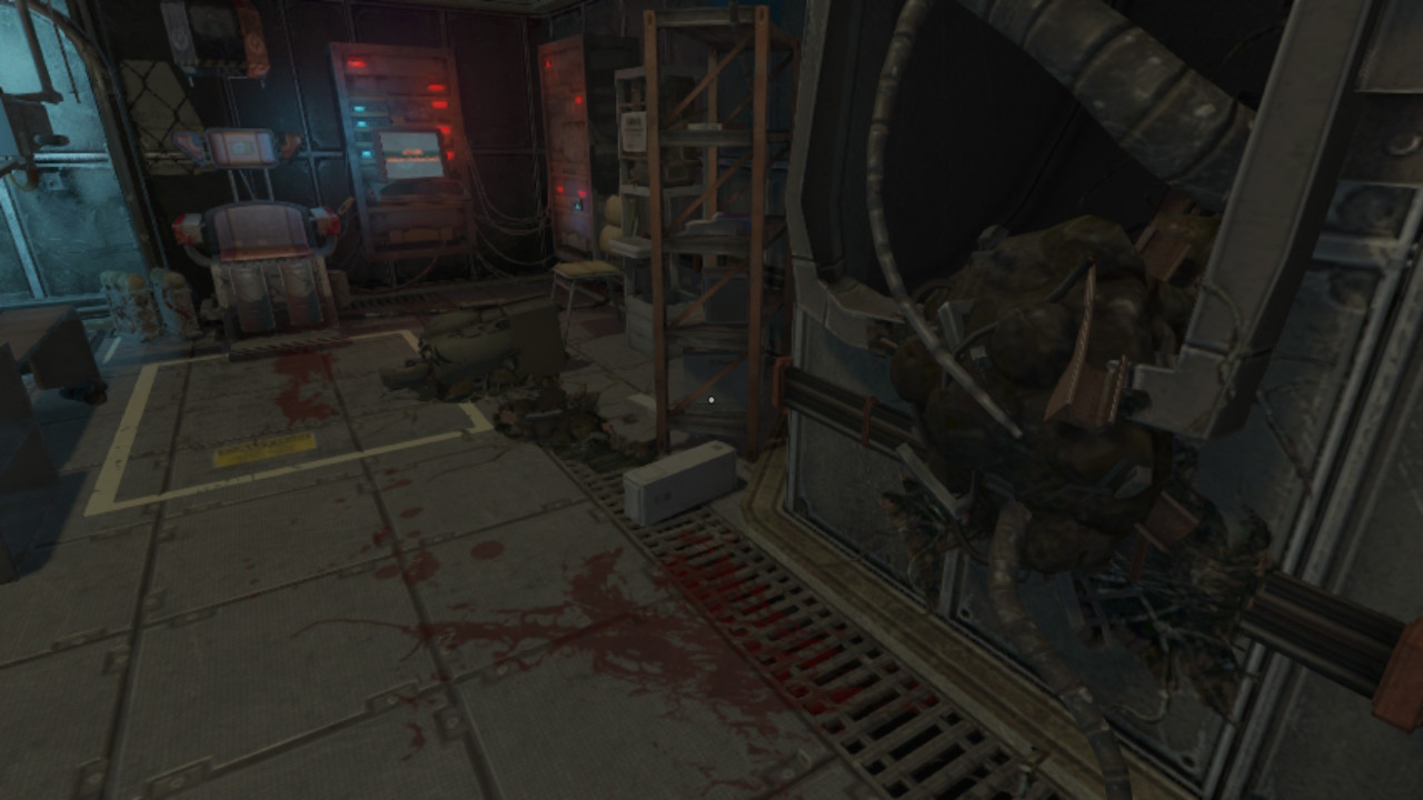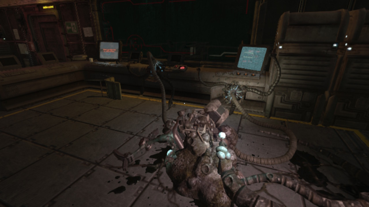 Nasz bohater na szczęście mówi i czasem komentuje wydarzenia na ekranie. Czasem mamy też dostęp do specjalnych terminali, które przywołują „wspomnienia” nieznanych nam osób i wydarzeń. Co jednak wydarzyło się na stacji? Jest ona dość wyraźnie w ruinie, sporo w niej robotów (głównie popsutych) i stert cementu wymieszanego z czymś, co wygląda jak organiczna tkanka. Czym jest to dziwne… coś?