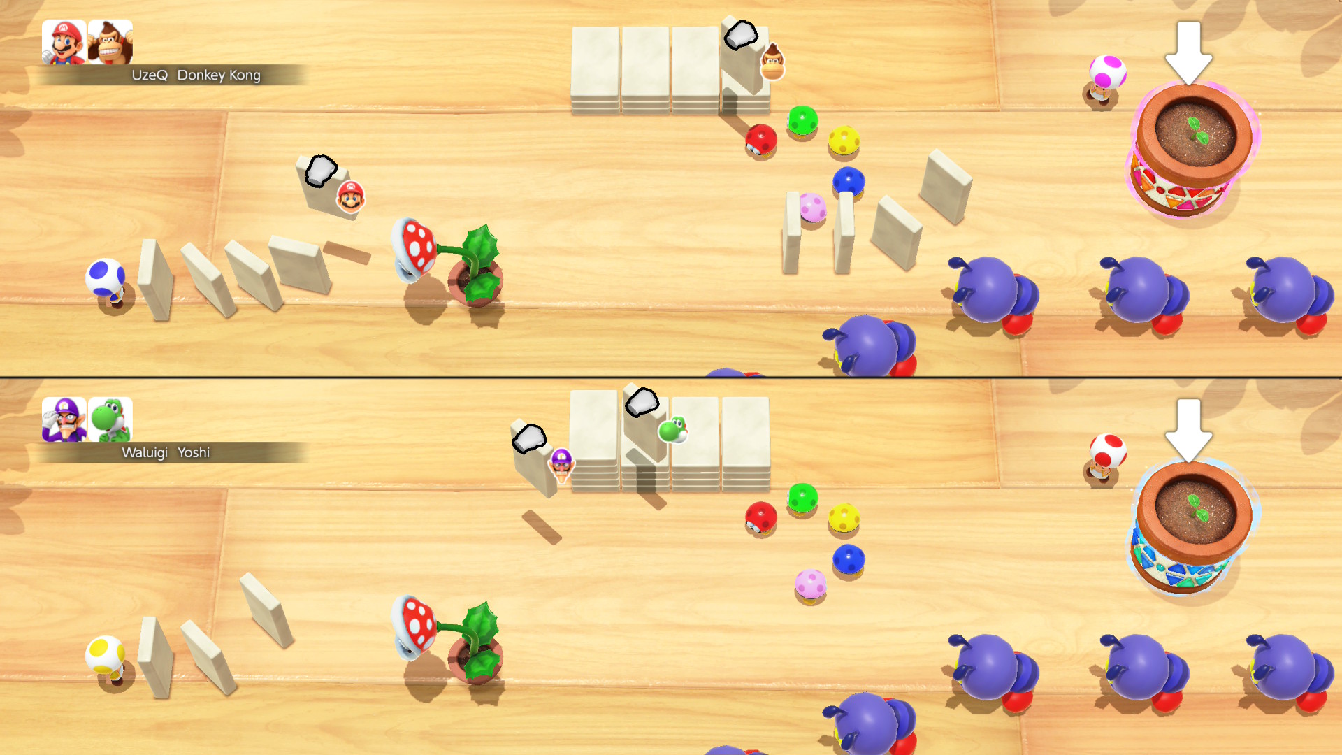 I z tym wiąże się chyba największy problem całej tej kolekcji. Mamy tutaj jakby dwie całkowicie osobne wersje tej samej gry. Jedna to Mario Party Jamboree, która jest po prostu klonem wersji z pierwszego Switcha. Nie znajdziemy tam żadnych nowości, nowych mini-gier ani mechanik – to dokładnie ta sama gra. Potem mamy też dostęp do Mario Party Jamboree w ramach Jamboree TV. I ta wersja nie dość, że wygląda ładniej, to korzysta ze wszystkich wymienionych wcześniej nowości. Nie rozumiem, jaki był sens pakowania dwa razy tego samego. Nintendo totalnie nie przemyślało interfejsu i nie zdziwię się, jeśli wielu graczy odrzuci ten tytuł, bo zamiast sięgnąć po Mario Party wewnątrz Jamboree TV, uruchomią „normalne” Mario Party i nie zobaczą żadnych nowości. Nie rozumiem tego rozdzielenia.