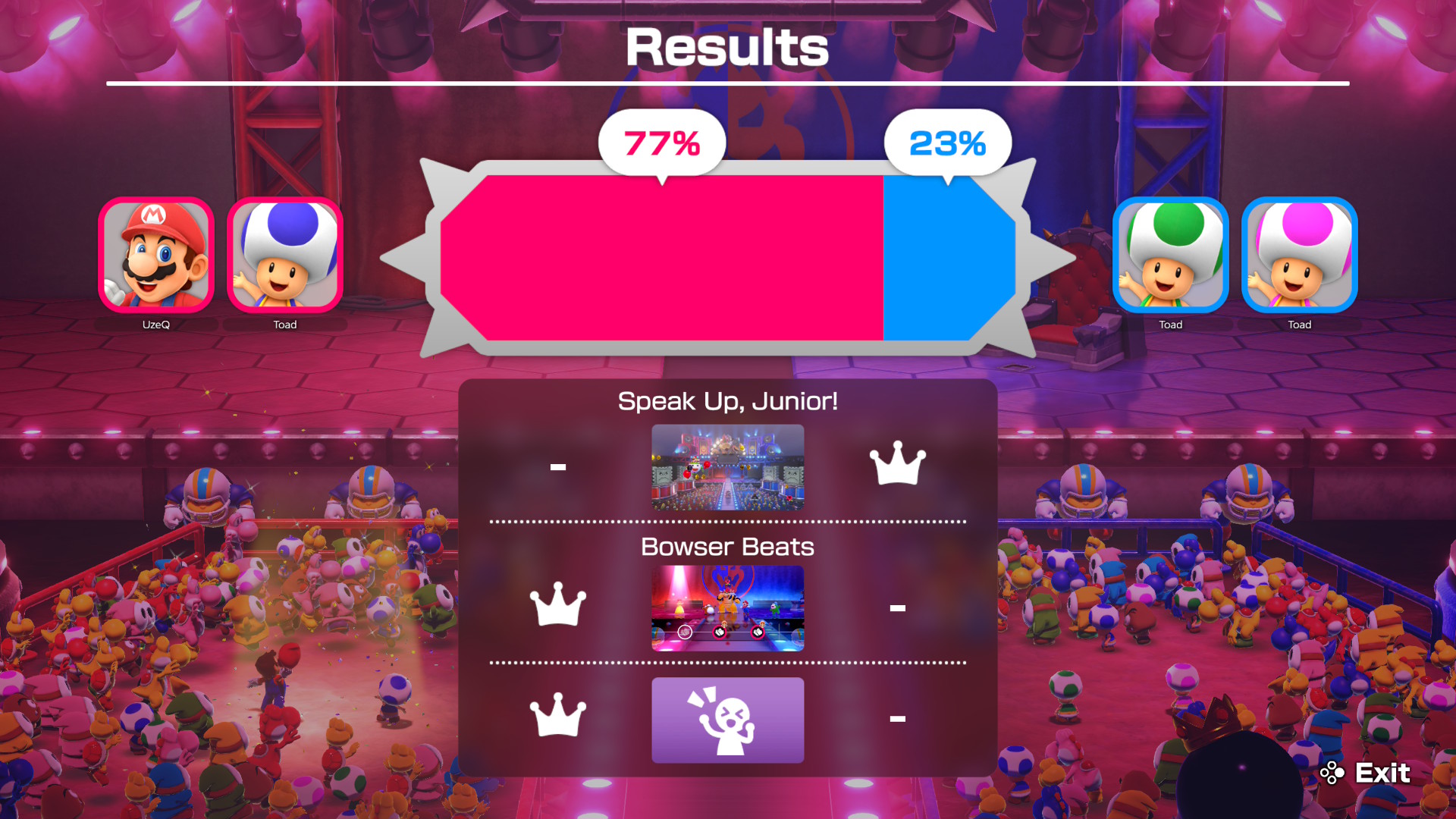 Na sam koniec jest też tryb dowolny, gdzie możemy z innymi graczami rywalizować tylko w poszczególnych mini-grach. To doskonały sposób na zapoznanie się z zawartością i spokojne poćwiczenie niektórych mini-gier.
