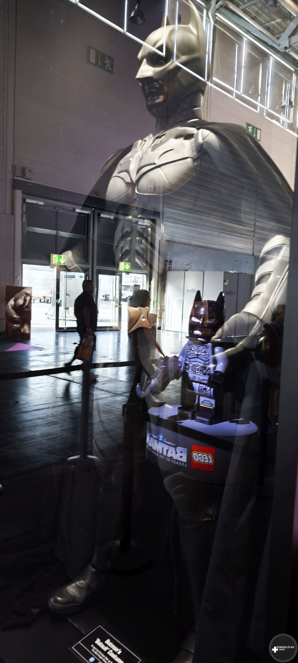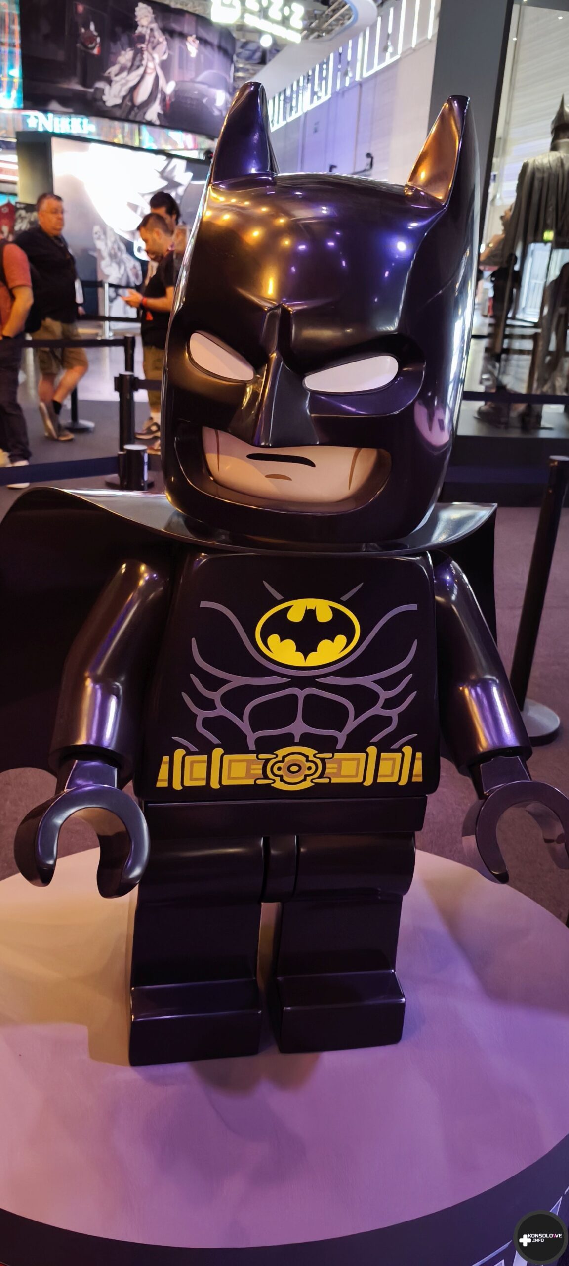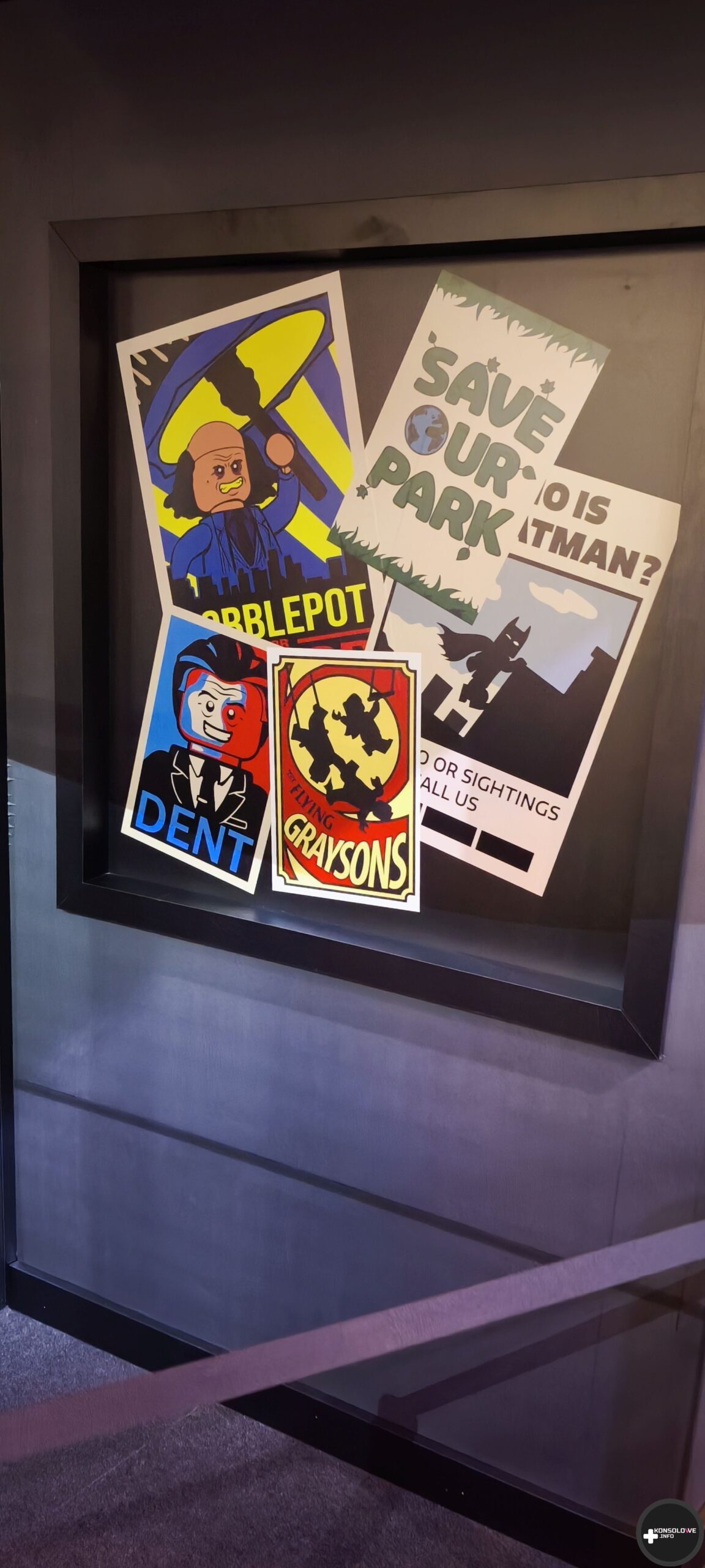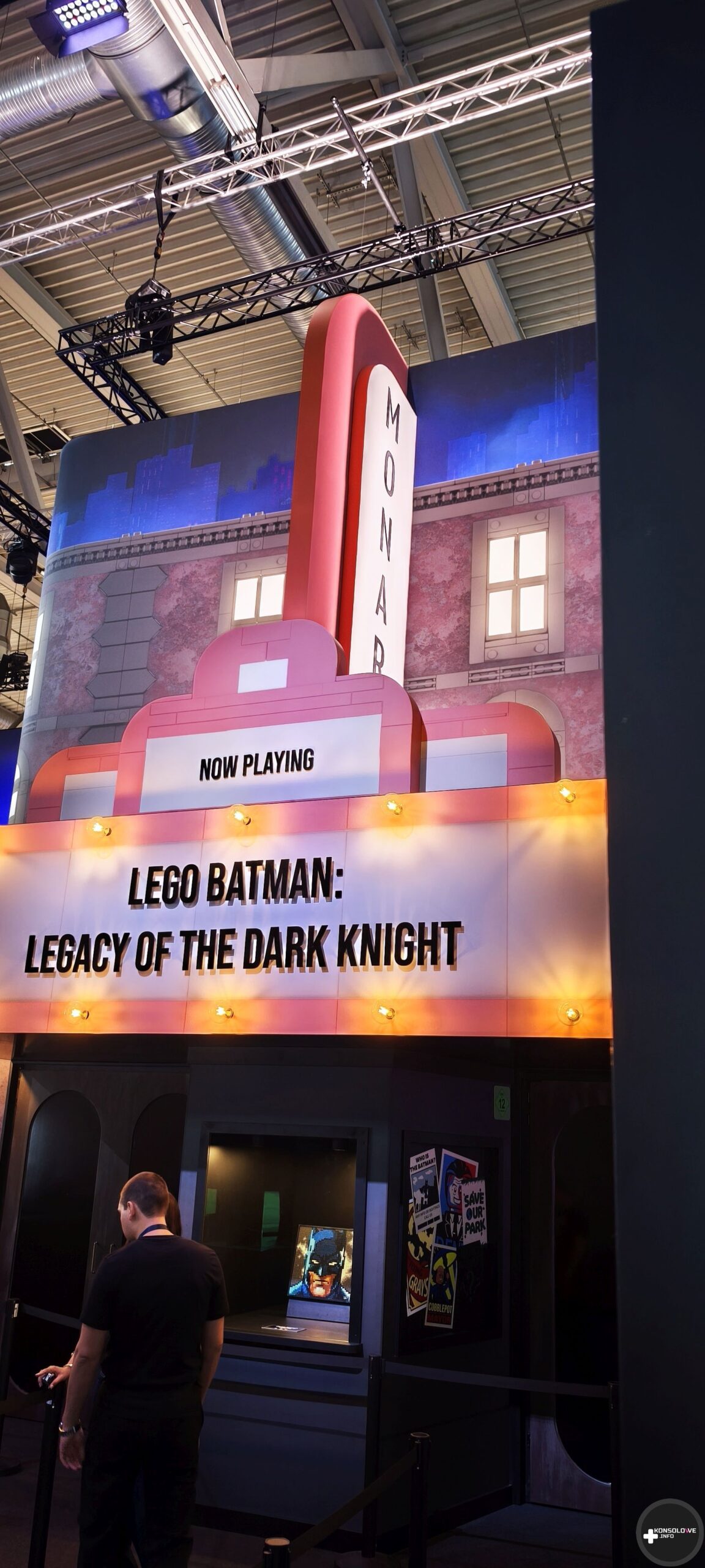 Natkniemy się też na wyeksponowane batarangi i bat-pazur. Nie sposób również nie docenić wystawionych strojów z filmów – coś dla siebie znajdą zarówno fani wersji Nolana, jak i Nietoperza w wykonaniu Pattinsona. Natomiast ściany przedstawiają uliczki Gotham, gdzie możemy natknąć się na plakaty Cobblepota, Denta czy nagłówki gazet dyskutujące na temat Batmana. Przed zagraniem w demo TT Games wprowadza wszystkich chętnych do sali gdzie na wielkim ekranie kinowym przedstawia zasady rozgrywki i sterowania. Pięknym, wzruszającym wręcz, smaczkiem jest fakt, iż projekcja odbywa się w Monarch Theatre. Nad jego drzwiami widać informację o najnowszej premierze – LEGO Batman: Legacy of The Dark Knight. Łezka może się w oku zakręcić. Niżej możecie zobaczyć małą galerię zdjęć, jakie uchwyciłem w tej strefie.