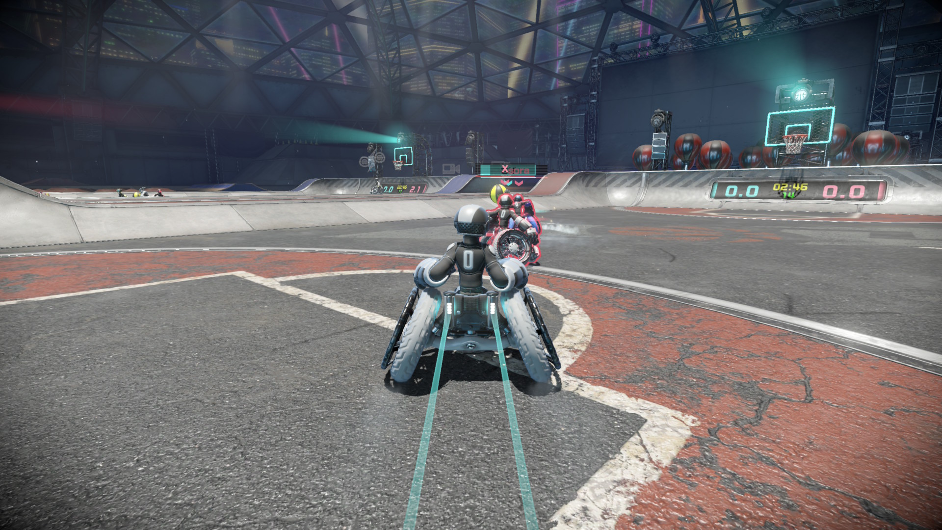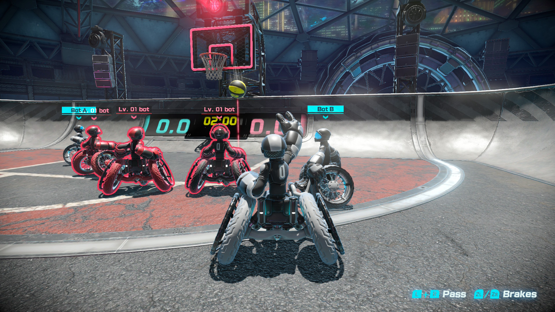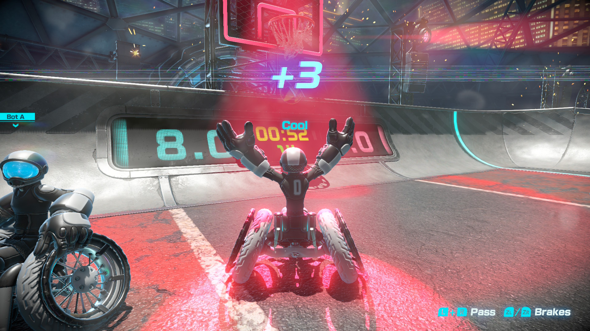 Gdy mamy piłkę, uniesienie Joy-Cona pozwala oddać rzut. Zasady są znajome – trafienie za 2 lub 3 punkty, dodatkowe oczka za efektowne sztuczki (np. wsad po wybiciu z rampy). Mecze rozgrywają się w drużynach 3 na 3, a podania do kolegów z zespołu są kluczowe.