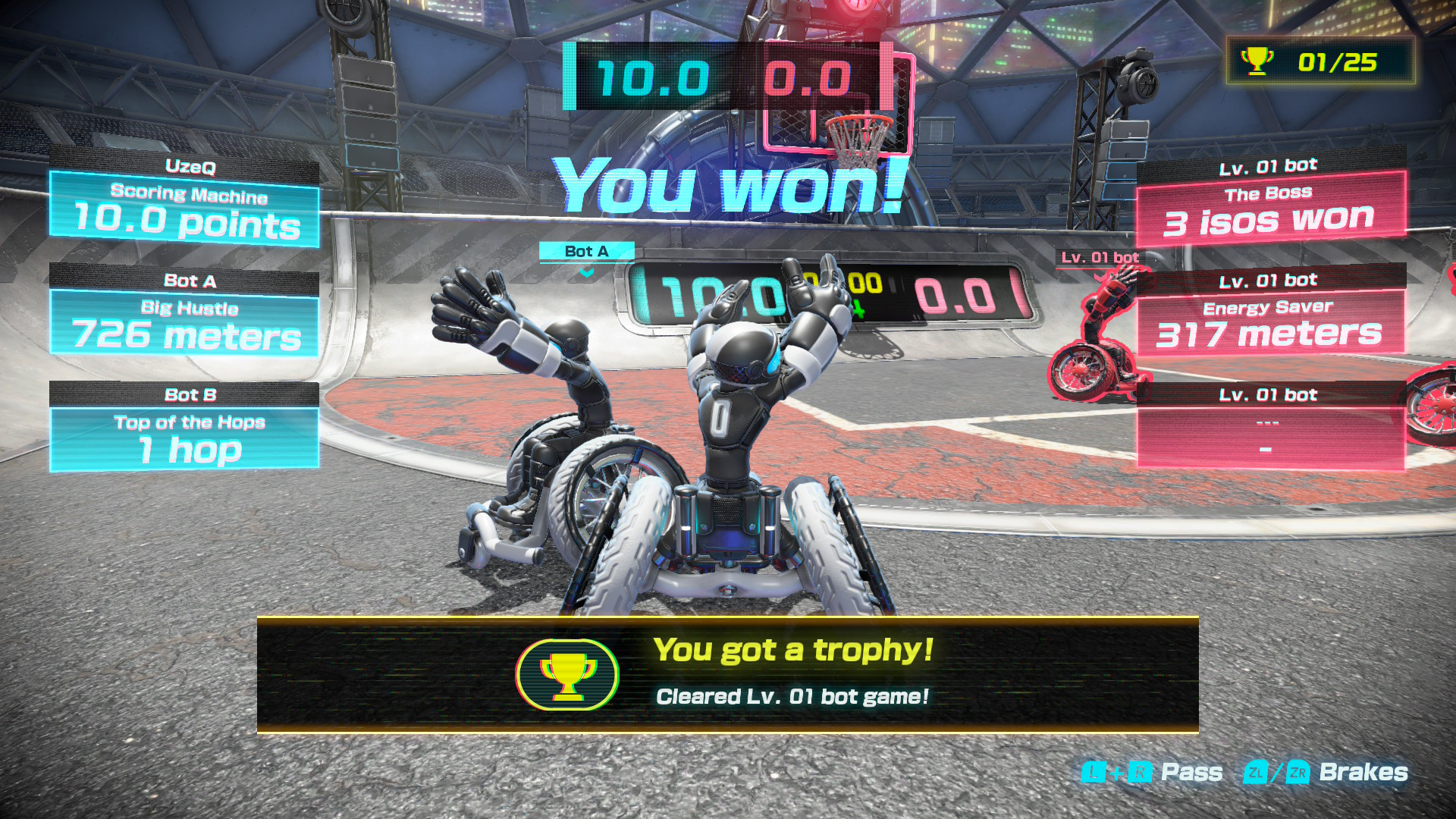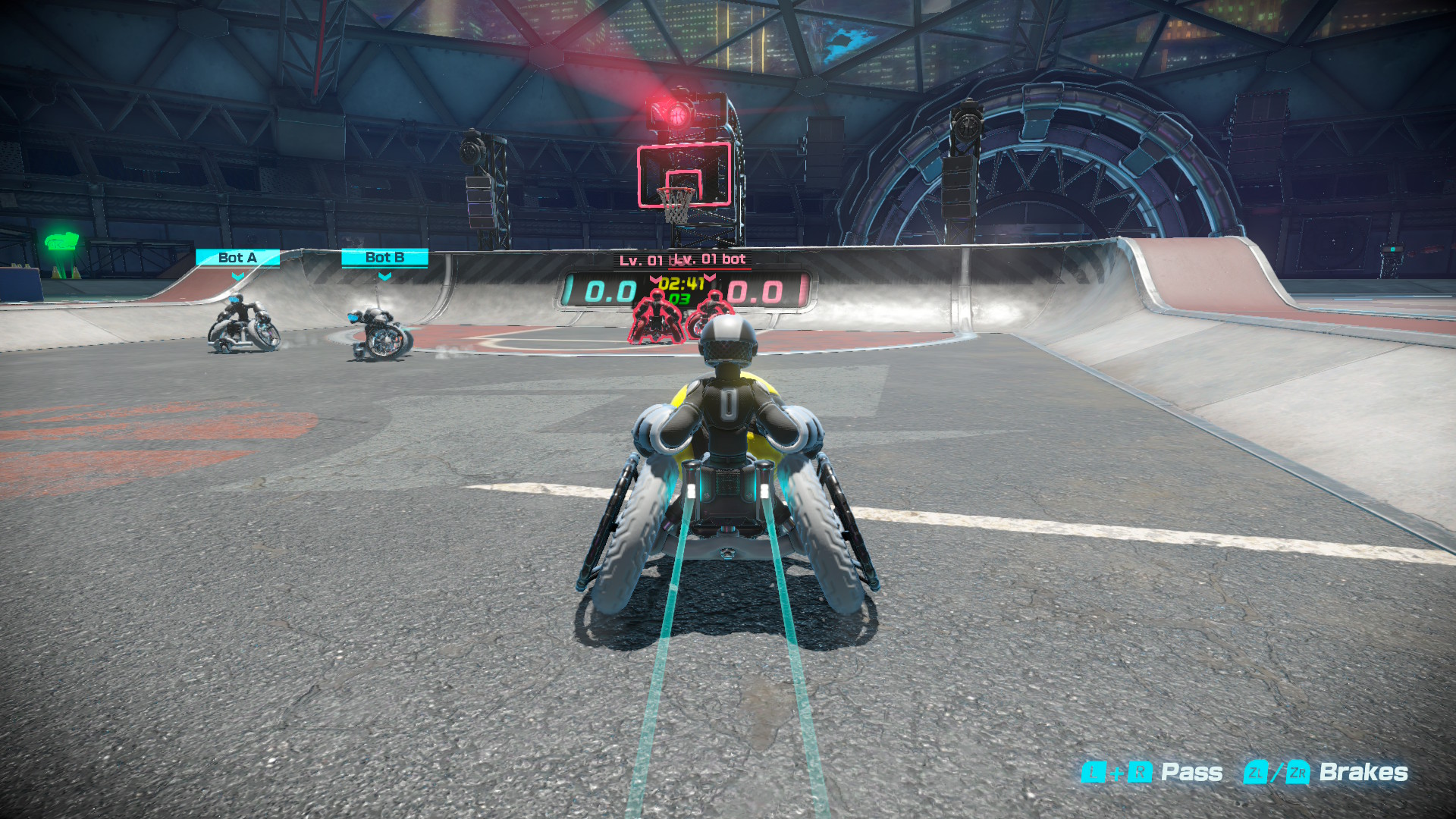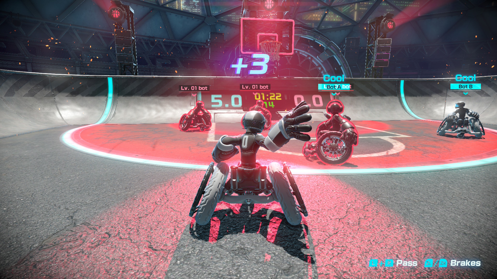Gdy mamy piłkę, uniesienie Joy-Cona pozwala oddać rzut. Zasady są znajome – trafienie za 2 lub 3 punkty, dodatkowe oczka za efektowne sztuczki (np. wsad po wybiciu z rampy). Mecze rozgrywają się w drużynach 3 na 3, a podania do kolegów z zespołu są kluczowe.