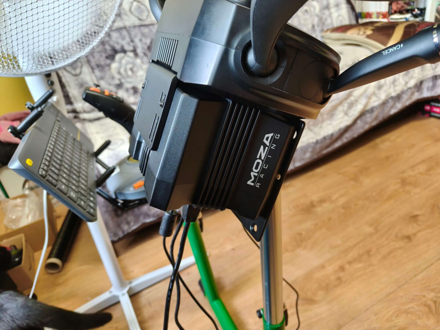 Następnie przyszedł czas na montaż bazy MOZA R5 wraz z ogromną kierownicą TSW Truck do płytki montażowej na centralnej kolumnie. Jeżeli posiadacie tylko dowolną bazę MOZA w zakresie od R3 do R9 oraz samą kierownicę TSW Truck, to nie napotkacie żadnych problemów montażowych. W przypadku posiadania dodatkowo manetek Multi-function Stalks może wystąpić problem z regulacją nachylenia kąta płytki montażowej. Jednak na szczęście da się to łatwo rozwiązać. Otóż musicie element montażowy Multi-function Stalks zamontować od góry bazy, zamiast od dołu.