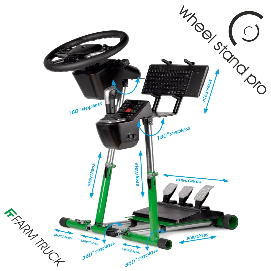 Wheel Stand Pro Farm Truck, to stojak oparty na teleskopach oraz szybko-zapinaczach (system quick-release). Więc jego możliwości regulacji są dosyć zaawansowane. Kolumna kierownicy oferuje płynną regulację pochylenia w zakresie 360°. Dodatkowo kolumna centralna ma płynną (bezstopniową) regulację poziomą w zakresie 7 cm (lewo–prawo). Płyta montażowa kierownicy ma regulację pochylenia w zakresie 180°. Podobną regulację ma płyta montażowa od skrzyni biegów. Płyta montażowa od manipulatorów nożnych ma regulację lewo/prawo w zakresie do czterech cm. Moduł balansujący od lewej strony ma regulacje w zakresie od 400 do 565 mm. Jeżeli chodzi możliwości regulacji wysokości teleskopów, to producenta zaleca, aby rurka wewnętrzna, została w rurce zewnętrznej minimum na długości 4 centymetrów.