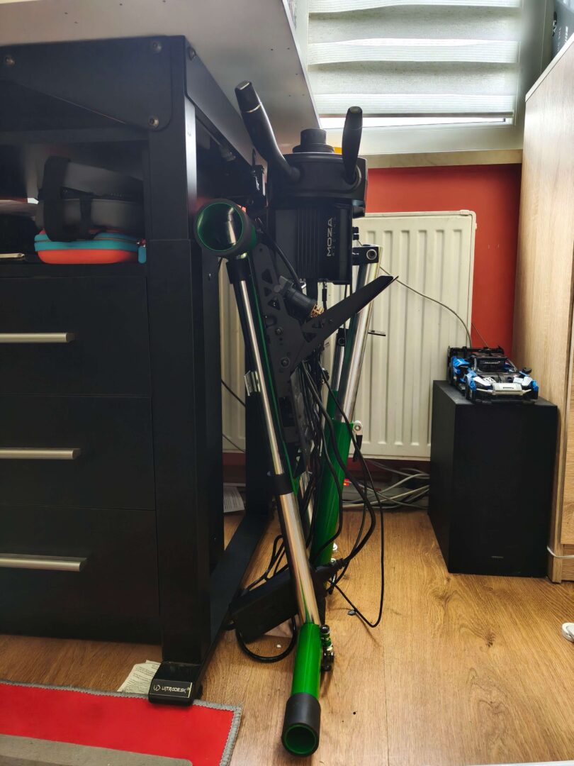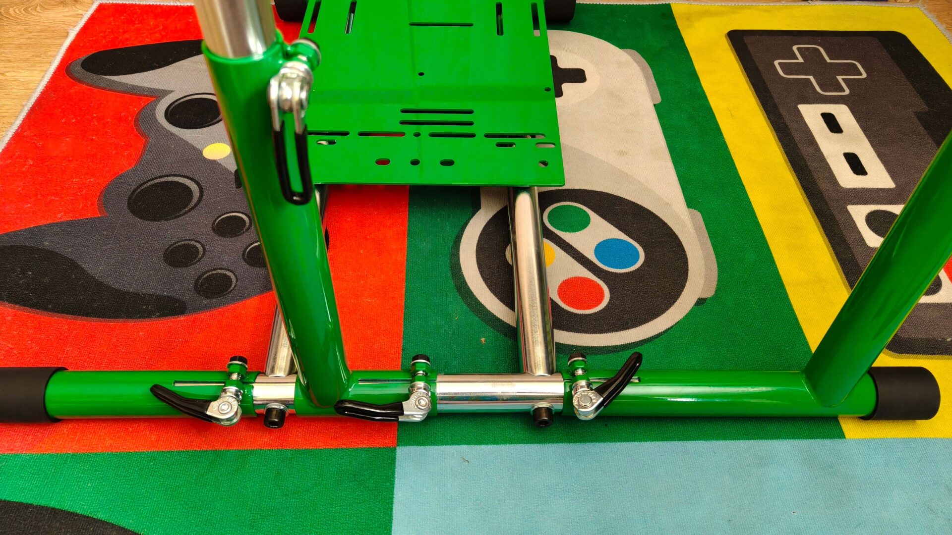 Użytkownicy, którzy do tej pory decydowali się na polskie stojaki wyścigowe Wheel Stand Pro, bez wątpienia najbardziej chwalili je za łatwość przechowywania. Wystarczy po prostu centralną kolumnę opuścić, aby stojak wraz z zamontowaną kierownicą i manipulatorami nożnymi zmieścił się do szafy, pod łóżkiem, czy po prostu stał w miejscu, gdzie nie będzie zawadzał. WSP Farm Truck jest znacznie szerszy od normalnego stojaka wyścigowego WSP. Jednak po pochyleniu kolumny centralnej oraz bocznej również możemy wsunąć go pod łóżko. W moim przypadku złożony WSP Farm Truck kapitalnie stoi sobie przy prawej stronie biurka. Oczywiście moje biurko jest duże i elektryczne, ale nie zmienia to faktu, że złożony stojak świetnie wpasowuje się po jego prawej stronie. Rozłożenie stojaka i przygotowanie do gry zajmuje zaledwie kilka minut. Warto zauważyć, że taki zestaw trochę waży, a gumowe stopki skutecznie umożliwiają przesuwanie go po panelach.