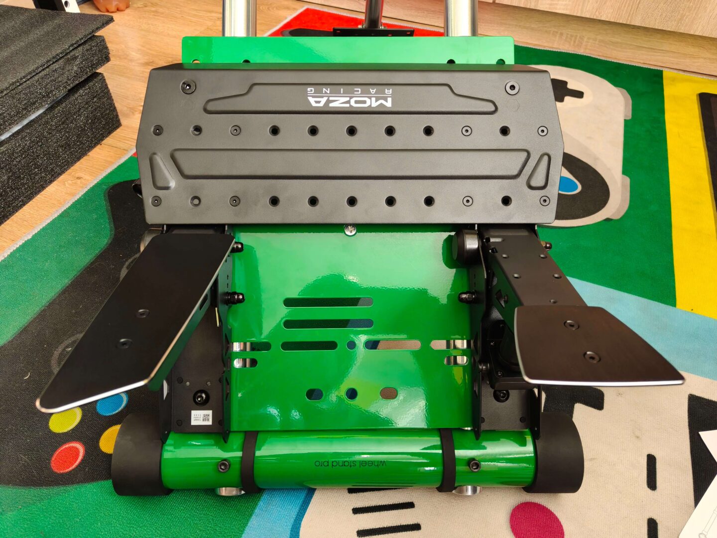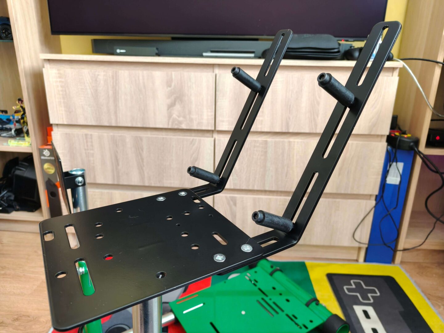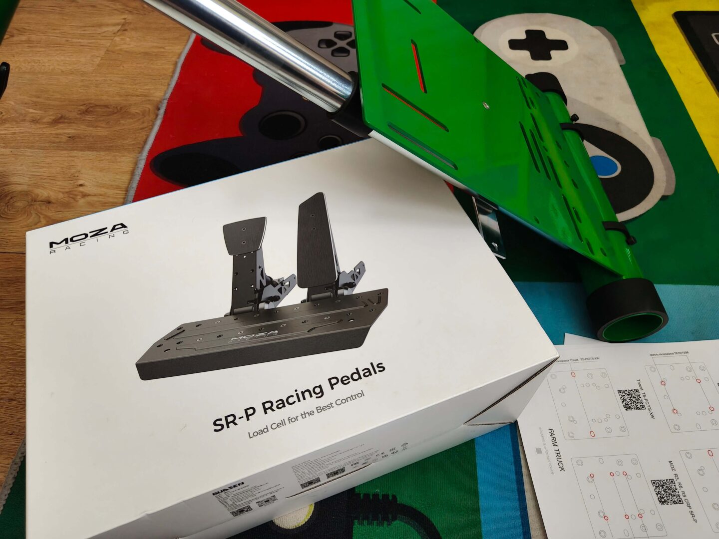 Umieszczenie zestawu MOZA TSW Truck na Wheel Stand Pro Farm Truck zacząłem od przymocowania zestawu manipulatorów nożnych Moza Racing SR-P do blachy montażowej. Blacha mocowania pedałów powinna leżeć na czterech gumach, natomiast do stojaka przykręcamy ją za pomocą jednej długiej śruby oraz dosyć grubej blaszki. Blacha ma wie różnych otworów, tak aby była kompatybilna z manipulatorami nożnymi różnych producentów. Jak widzicie na załączonych zdjęciach poniżej bez problemu udało mnie się zamontować pedały Moza Racing SR-P do blachy za pomocą czterech śrub. Mocowanie jest bardzo solidne, nie ma szans, aby zestaw manipulatorów nożnych uległ, jakiemukolwiek przemieszczaniu.