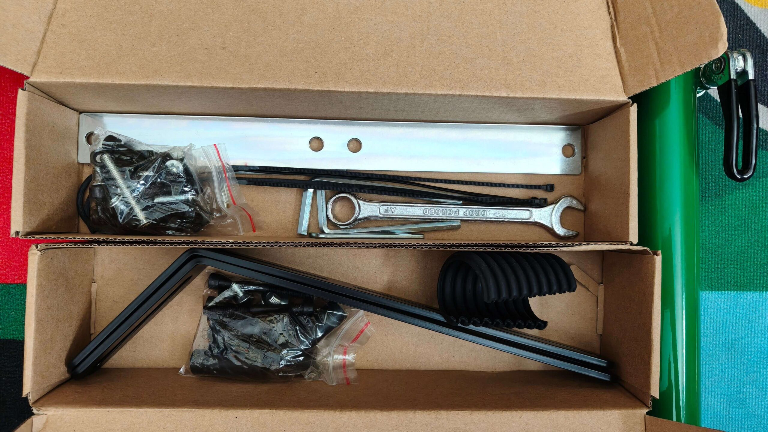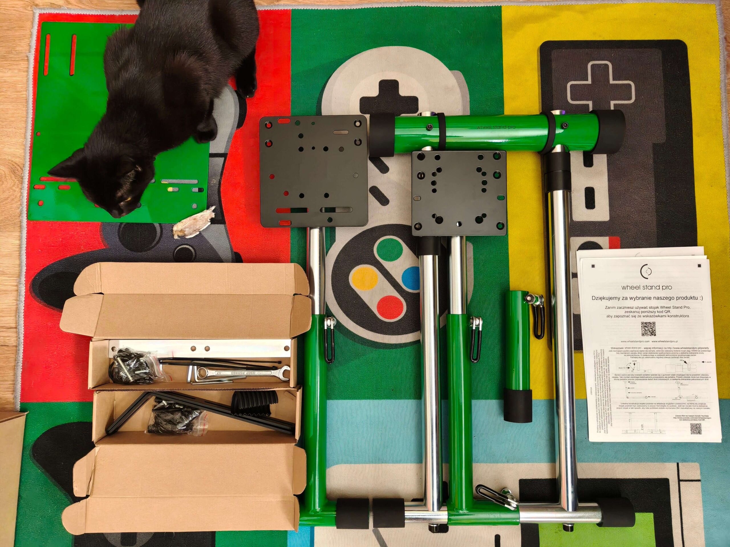 Wheel Stand Pro Farm Truck przychodzi w dużym, płaskim kartonowym pudełku. Sam karton mogę uznać za ekologiczny, gdyż użyto tylko czarnej farby do zaprezentowania stojaka po złożeniu na froncie opakowania. Natomiast z tyłu znajdziemy możliwości konfiguracji wraz z listą kompatybilnych kierownic oraz kolorem. Do wyboru są trzy kolory: zielony, żółty oraz czerwony. Mimo braku użycia styropianu wszystko dobrze jest zabezpieczone za pomocą wkładek z kartonu. Zestaw składa się z kolumny centralnej, to do niej montujemy bazę z kierownicą oraz manipulatory nożne. Dodatkowym modułem w WSP Farm Truck, jest kolumna boczna, do której montujemy skrzynie biegów oraz klawiaturę. W zestawie znajduje się jeszcze moduł balansujący, który zapewnia lepszą stabilność stojaka. Oczywiście nie zapomniano o różnych dodatkach i akcesoriach, jak śrubki, klucze, a nawet trytytki.