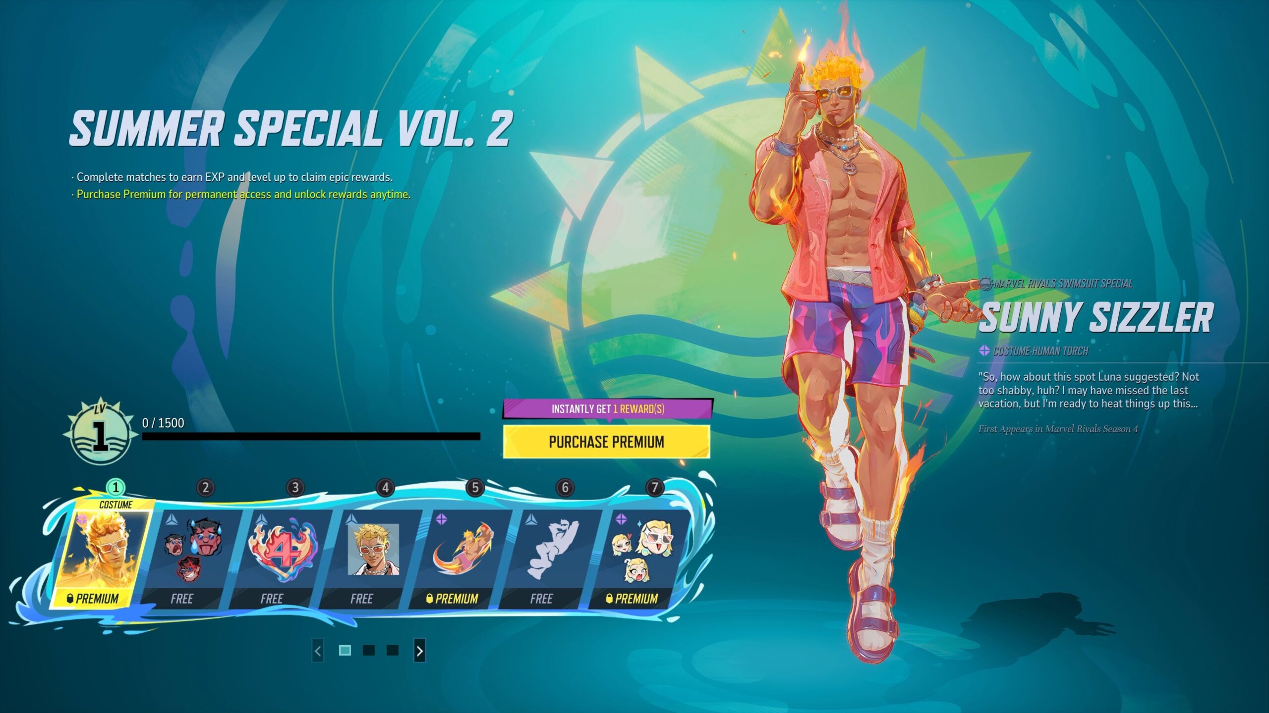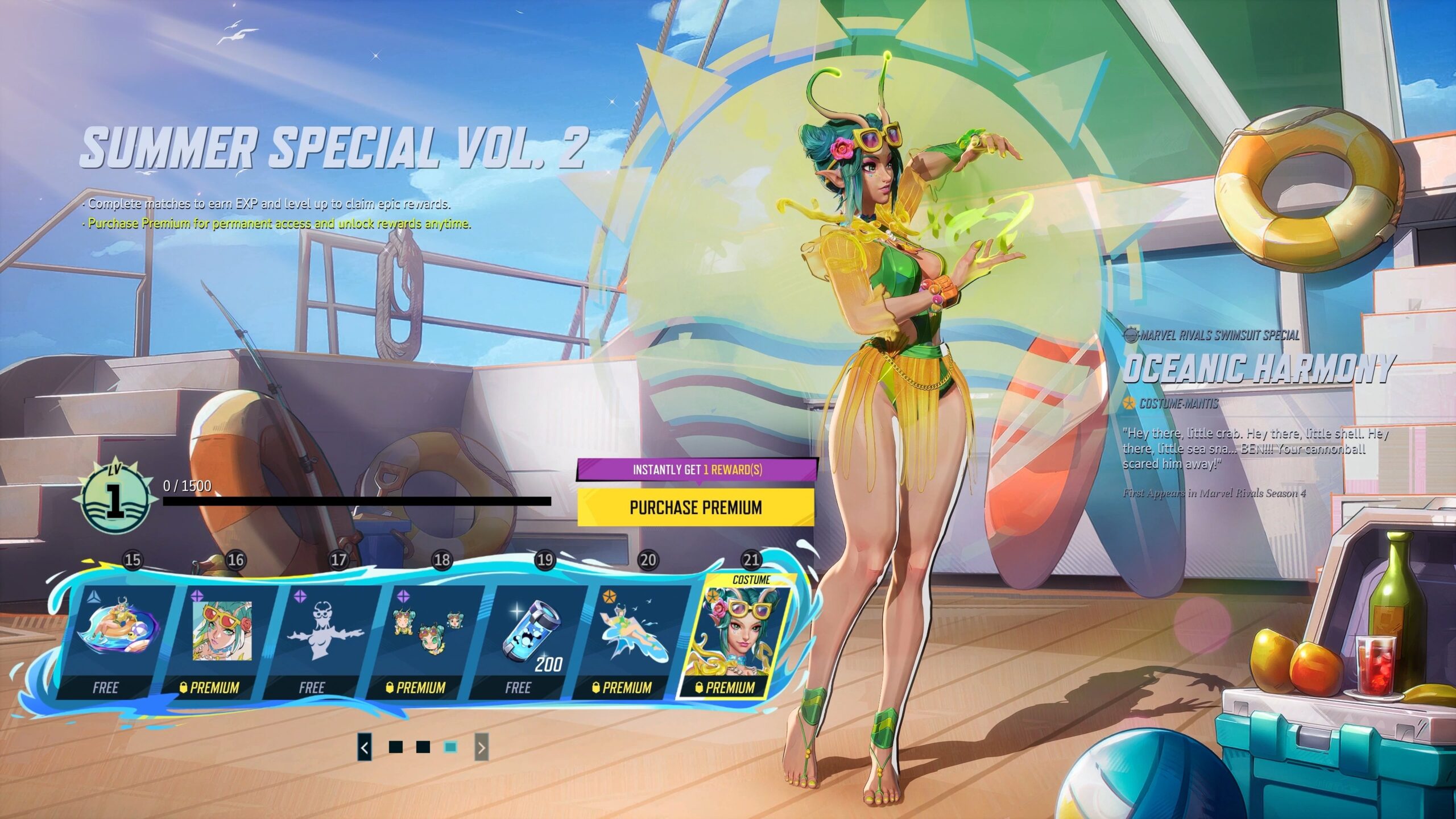 Także w czwartek rozpocznie się wydarzenie Summer Special vol. 2, w którym do zdobycia będą trzy skiny. Oczywiście dwa w wersji płatnej i jeden darmowy. Mini karnet prawdopodobnie będzie kosztował 990 monet. W wersji darmowej zdobędziemy kolejny skin dla Thing, natomiast w premium odblokujemy Human Torcha i Mantis.