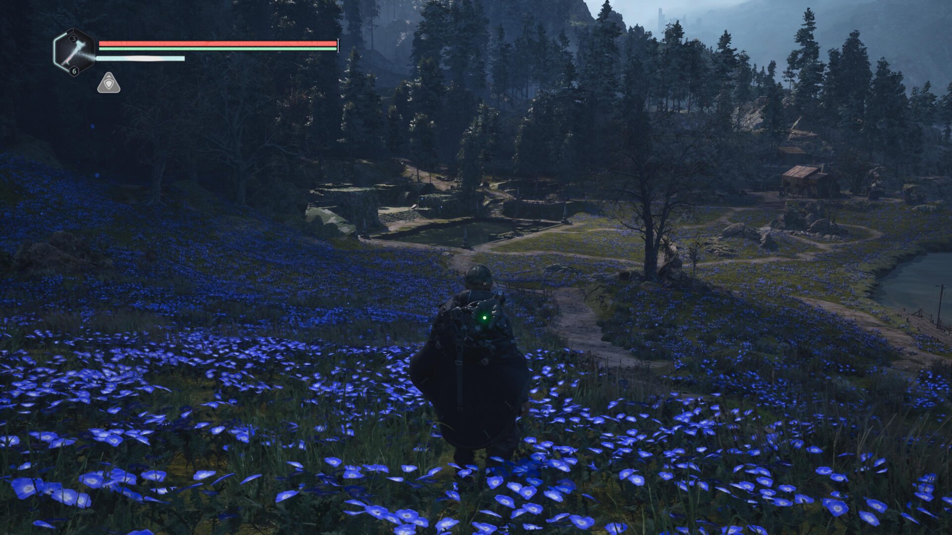 Przypominam, że Hell is Us to gra Player-Plattering. Czyli idziemy przed siebie bez celu. Cel wyznaczają nam napotkane postaci. Znaczy się jakiś tam główny cel mamy: w pierwszym akcie jest to poszukaj informacji o swojej rodzinie oraz kontynuuj misje ojca. Jednak gra sama niczego nam nie zaznacza. Nie mamy mapy świata i sami też nie możemy nanosić znaczników. Wszystkie nasze wyprawy to podróże na orientacje, kierunek tak naprawdę wyznaczają nam rozmowy z napotkanymi ludźmi. I nie, nie są to konkretne wskazówki: idź tam, odnajdziesz to i to. Często są to odpowiedzi w stylu: coś widziałem, coś słyszałem, udaj się na północny – wschód. Rozmowy to bardzo ważny aspekt tej gry, nawet niepozorny NPC może podzielić się kluczową informacją. Rozmowy również odblokowują nam podróż do kolejnej części świata gry.