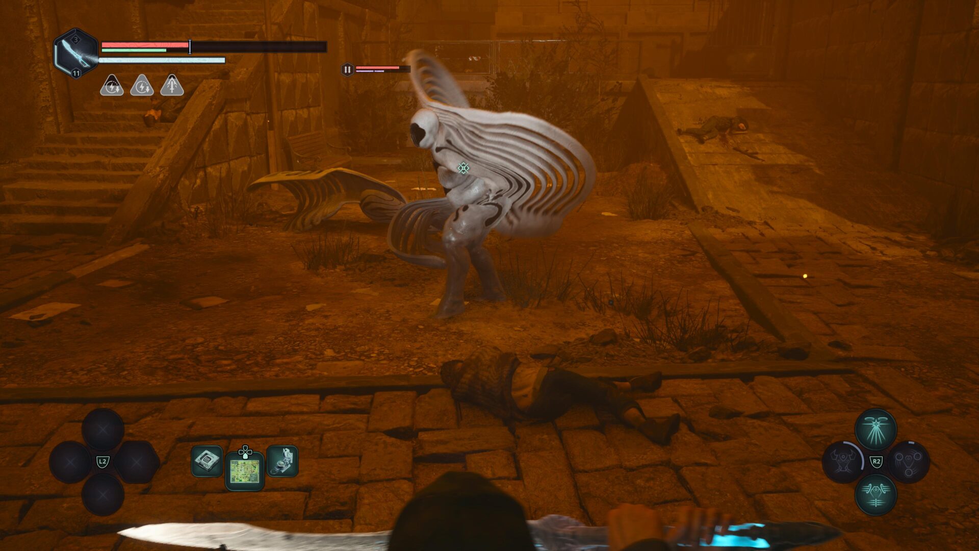 Naszymi przeciwnikami głównie są Hollow Walkerzy to humanoidalne stworzenia o jasnej skórze. Do tego często spotkamy tzw. połączonych przeciwników. To istota limbiczna, Hollow Walker połączony pępowiną z Haze, czyli dużym potworem o niekreślonym kształcie. Nie zabijemy Hollow Walkera, dopóki nie zniszczymy Haze. W takich momentach świetnie przydaje się rozproszenie z drona, które nakładamy Hollow Walkera, a my zabijamy Haze. W sumie to nie zabijamy, bo Haze chowa się do Hollow Walkera. Jeżeli nosiciela nie zabijemy odpowiednio szybko, to musimy ponownie walczyć z potworem o zmiennym kształcie. Czasami spotkamy bossów i mini bossów, którzy wypuszczają kilku Haze. I niestety w mojej opinii walka z tymi połączonymi przeciwnikami, to najsłabsza część gry – strasznie monotonna i szybko się nudzi. A wręcz stworzony na ekranie chaos nawet irytuje.