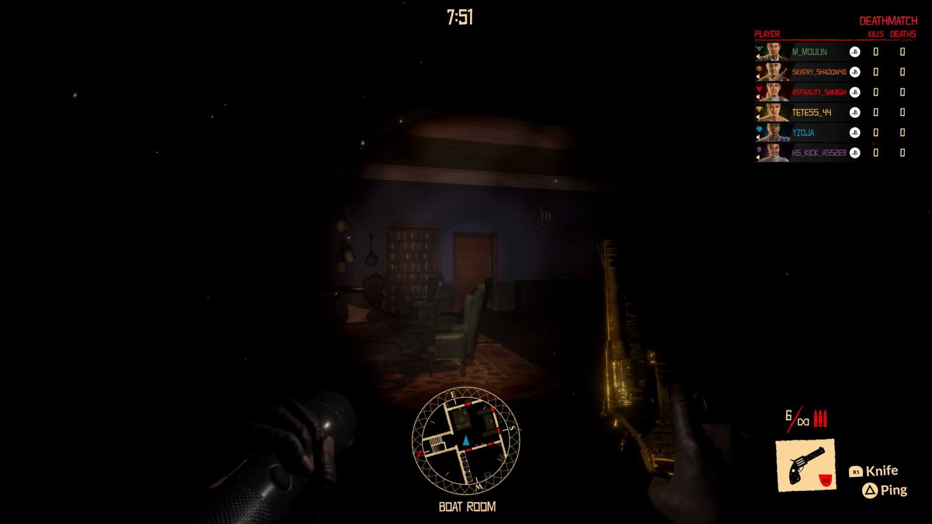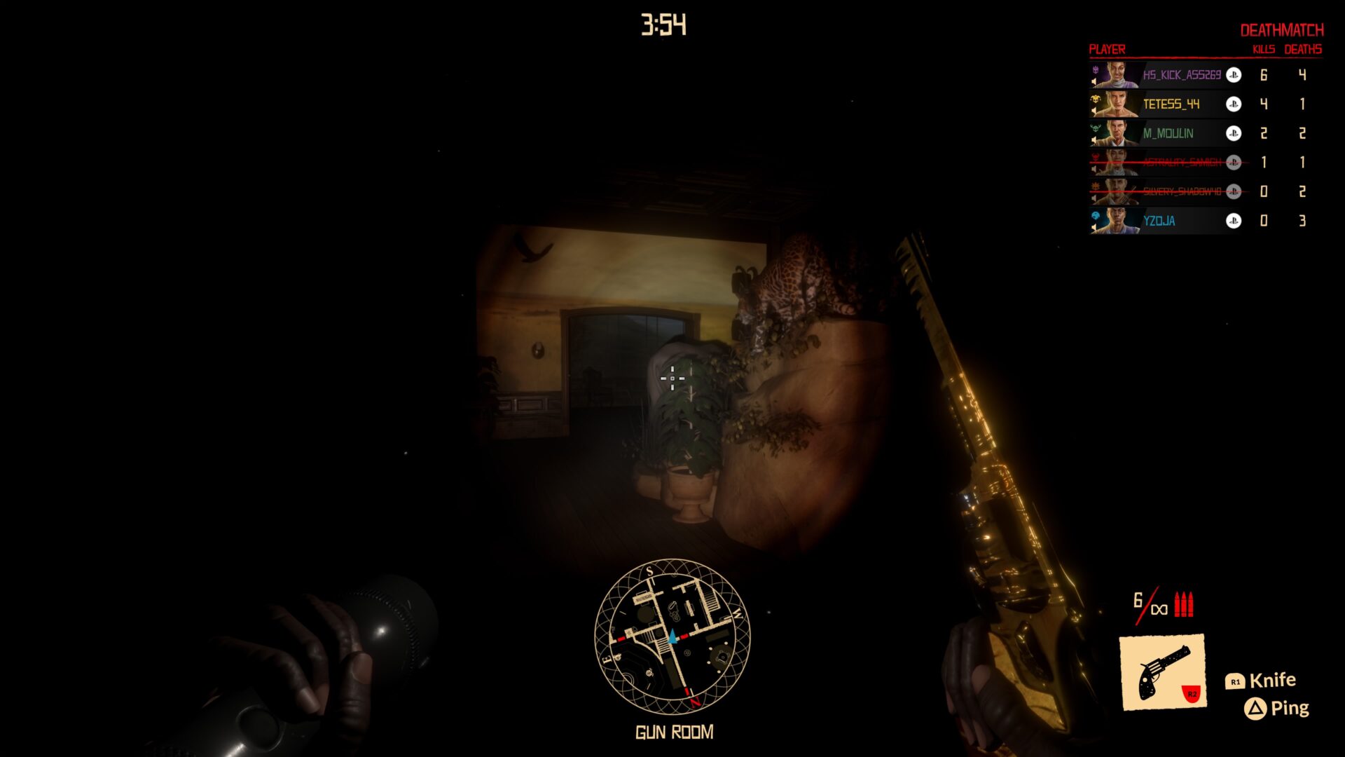 Z czasem, eksplorując mroczną posiadłość, zobaczymy mieniące się przedmioty, które będziemy mogli podnieść, albo wejść z nimi w interakcję. Chociaż w naszym naręczu znajdzie się jeszcze nóż, podczas intensywnych starć PvP nigdy nie udało mi się z niego skorzystać – rewolwer zabija głośno, ale z daleka.
