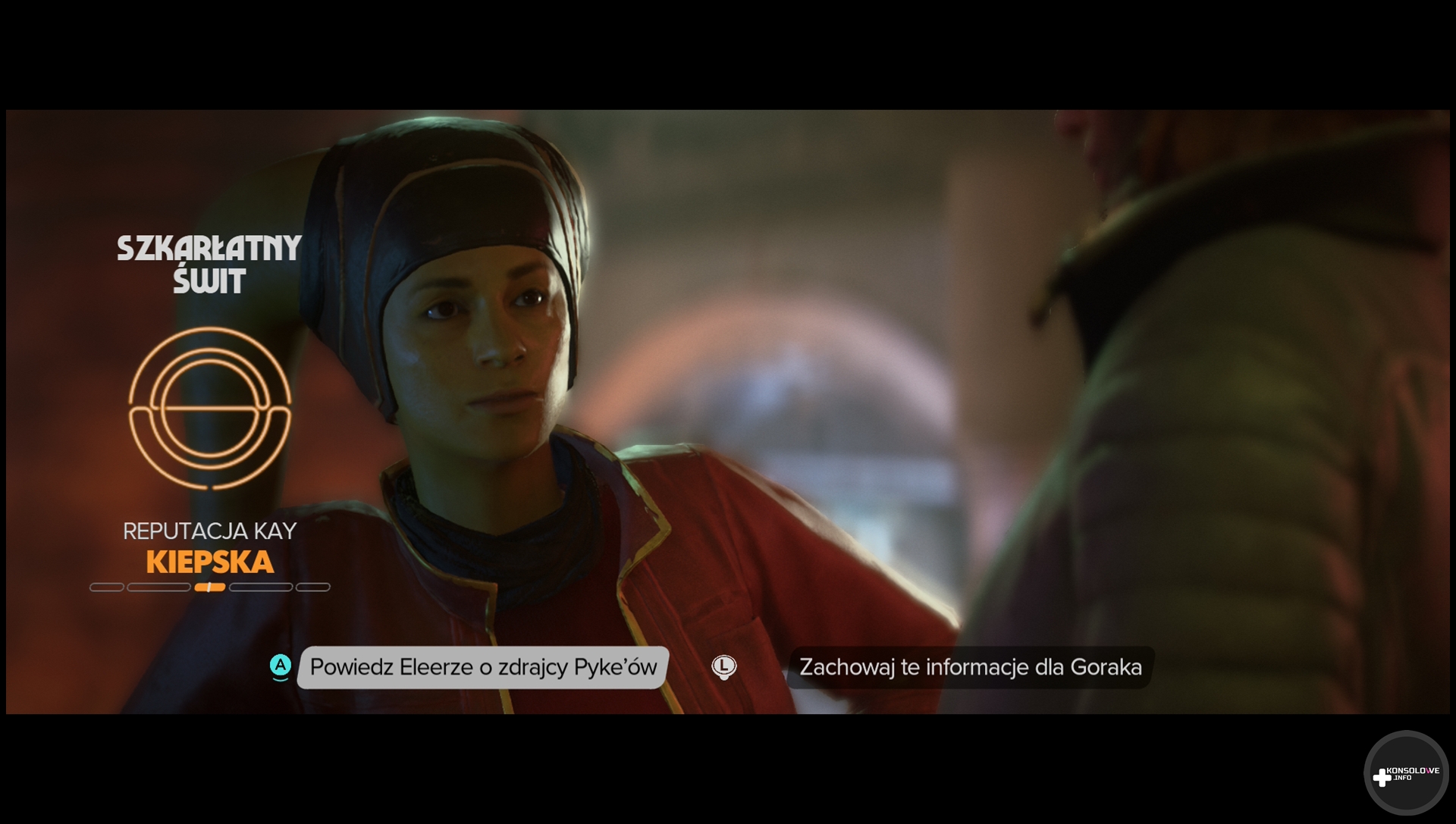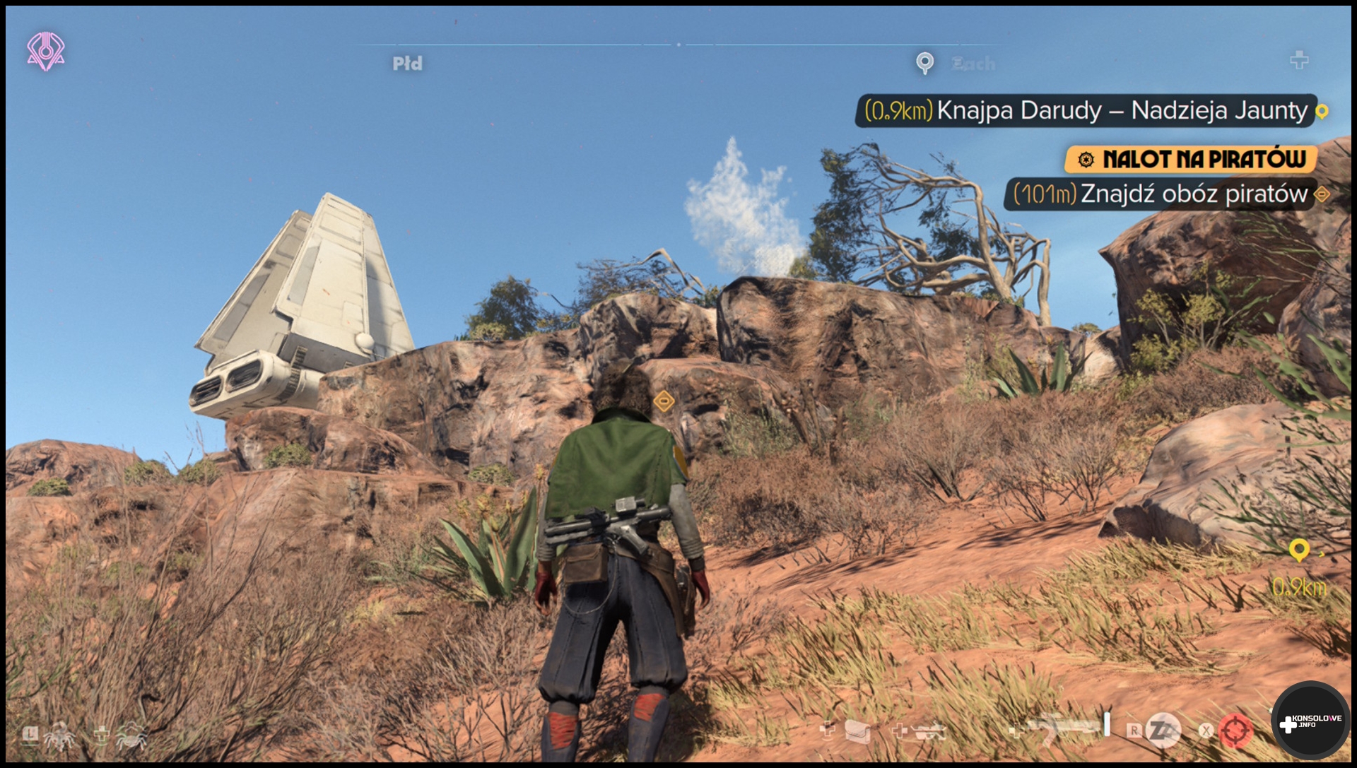 Nie twierdzę jednocześnie, że gra utrzymuje stałe 30 klatek na sekundę. Nie, tak absolutnie nie jest. Zdarzają się spadki poniżej tej wartości, aczkolwiek nie do poziomu, który od razu zamieniałby naszą przygodę w pokaz slajdów. Ubisoft po prostu celuje w 30 FPS i przez większość czasu udaje się osiągać ten cel. Moim zdaniem jest to imponujący wynik – zwłaszcza w zestawieniu z tym, jak ta gra się prezentuje – zwłaszcza, że występuje w niej ray tracing. Warto jeszcze wspomnieć o pewnych kwestiach technicznych w kontekście rozdzielczości. W trybie przenośnym mamy do czynienia z rozdzielczością 540p podbijaną poprzez DLSS do 720p, co jest w moim przekonaniu wystarczające jak na stosunkowo mały ekran. Natomiast po wsunięciu konsoli do stacji otrzymamy rozdzielczość 720p skalowaną aż do 1440p. Świetnie brzmią też odgłosy blastera, czy muzyka. Fani Gwiezdnych Wojen powinni usłyszeć wiele znajomych kompozycji. Podobnie jak docenić styl czcionki i powiadomień 🙂