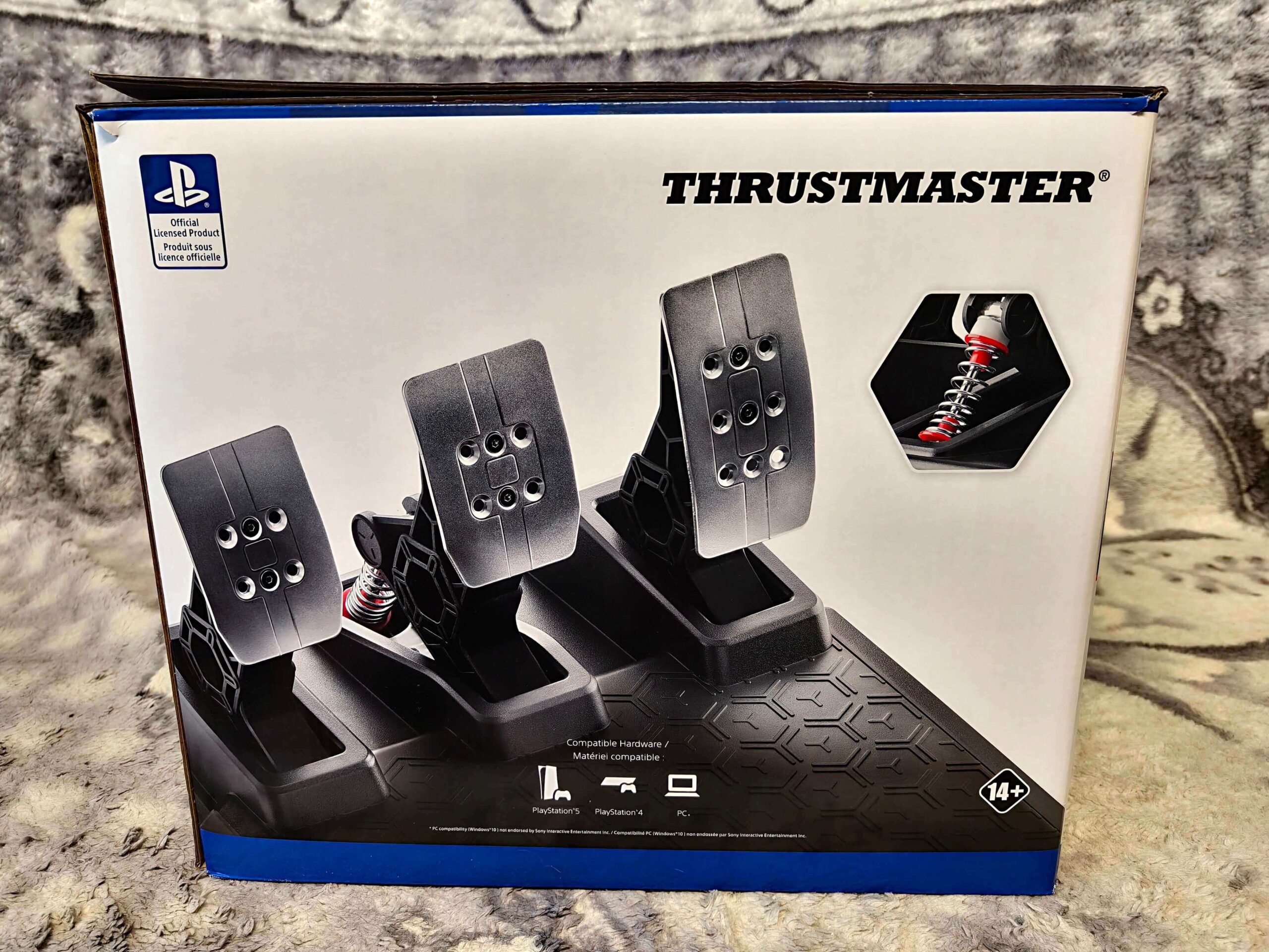 Kierownica Thrustmaster T248R do konsol PS4 i PS5 przychodzi w dobrze znanym białym opakowaniu z charakterystycznym niebieskim paskiem na dole. W dolnym prawym rogu znajdziemy logo PlayStation oraz informacje, że jest to produkt oficjalnie licencjonowany. W kartonie umieszczono oczywiście kierownicę Thrustmaster T248R wraz z uchwytem w kształcie podkowy do stabilnego zamocowania jej na blacie. Dołączony zestaw manipulatorów nożnych to dobrze znany model T3PM, który jest kompatybilny ze wszystkimi kierownicami Thrustmaster. Z mniejszych rzeczy nie mogło zabraknąć zasilacza, kabla USB oraz instrukcji – m.in. w języku polskim. Dodatkowo producent umieszcza w zestawie miękką sprężynę do pedału hamulca – domyślnie zamontowana jest twarda.