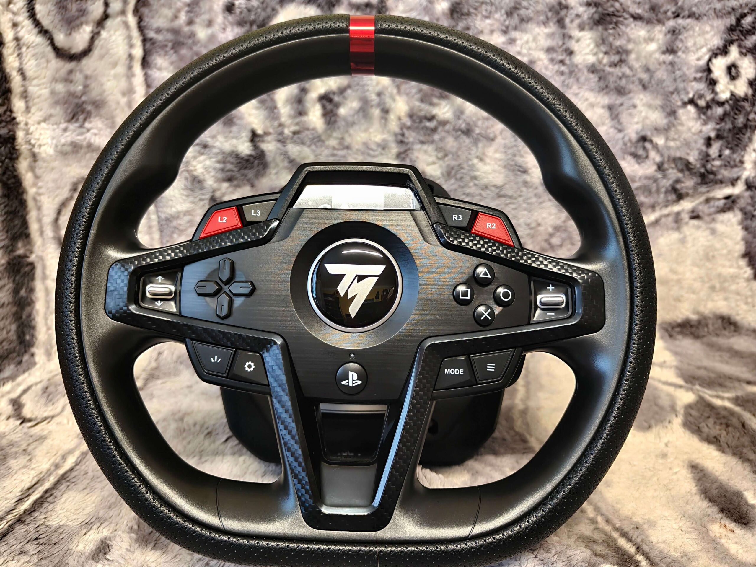 Jak można było się spodziewać Thrustmaster T248R, to kierownica po delikatnym liftingu z całkowicie nowym wyświetlaczem. Na obręczy umieszczony oddychającą skórę syntetyczną, która w środku wypełniona jest gąbką. Ramiona kierownicy nie są już srebrne, teraz pomalowaną je imitacją karbonu, co bardziej podkreśla sportowy styl kierownicy. Spore zmiany zaszły natomiast w układzie i wyglądzie kilku przycisków. L2 i R2 pomalowana na czerwono, natomiast w dolnej strefie nie ma już przycisku DISPLAY, zastąpiono go przyciskiem MODE. Natomiast zamiast MODE jest koło zębate. Przyciski share (po lewej) oraz options (po prawej) pozostały bez zmian. T248R ma średnice 28 cm oraz idealną wagę dla tych graczy, którzy chcą po raz pierwszy zasiąść za wyścigową kierownicą. A zaawansowane i drogie sprzęty z bezpośrednim napędem wydają się zbyt silne.