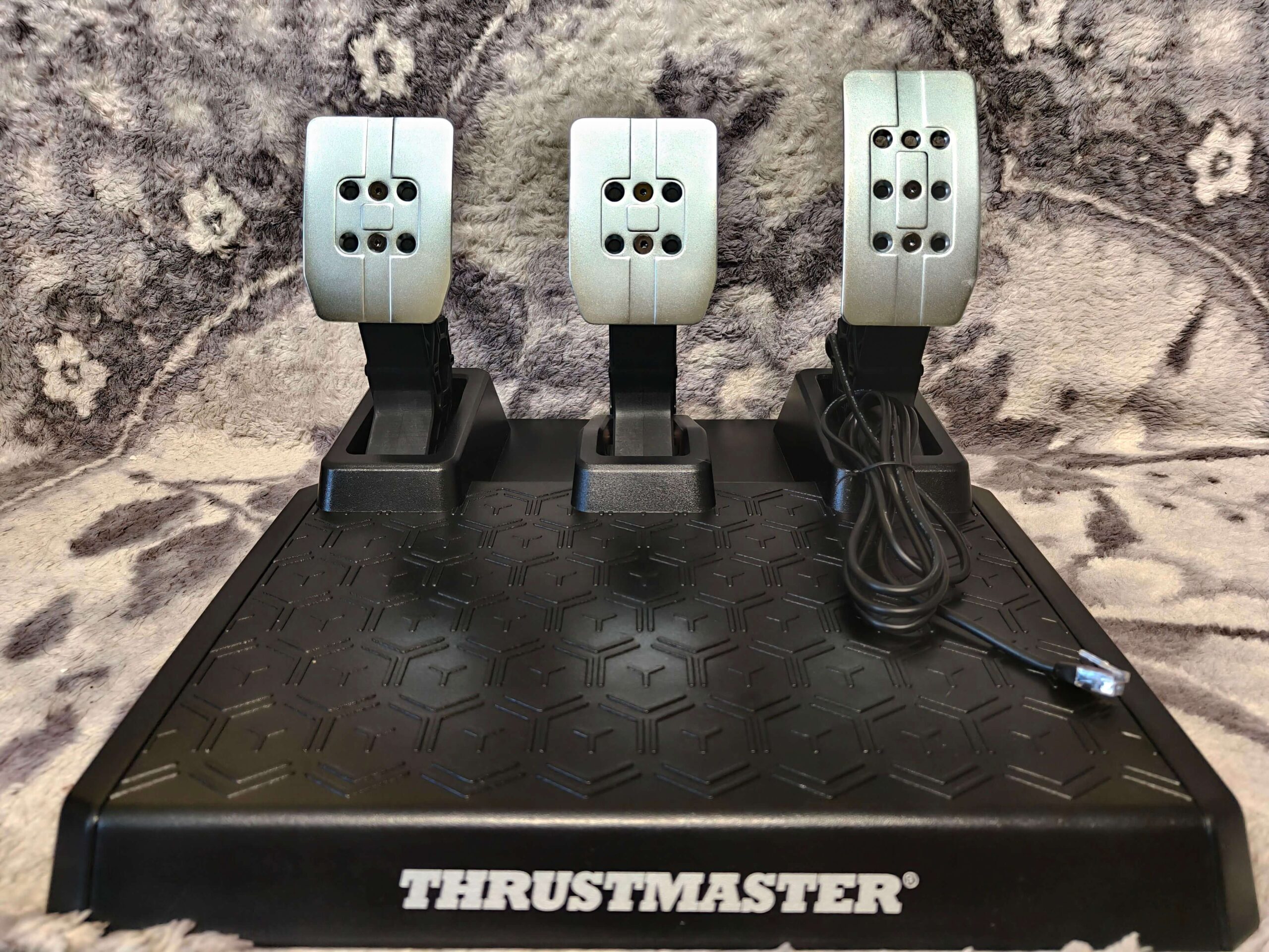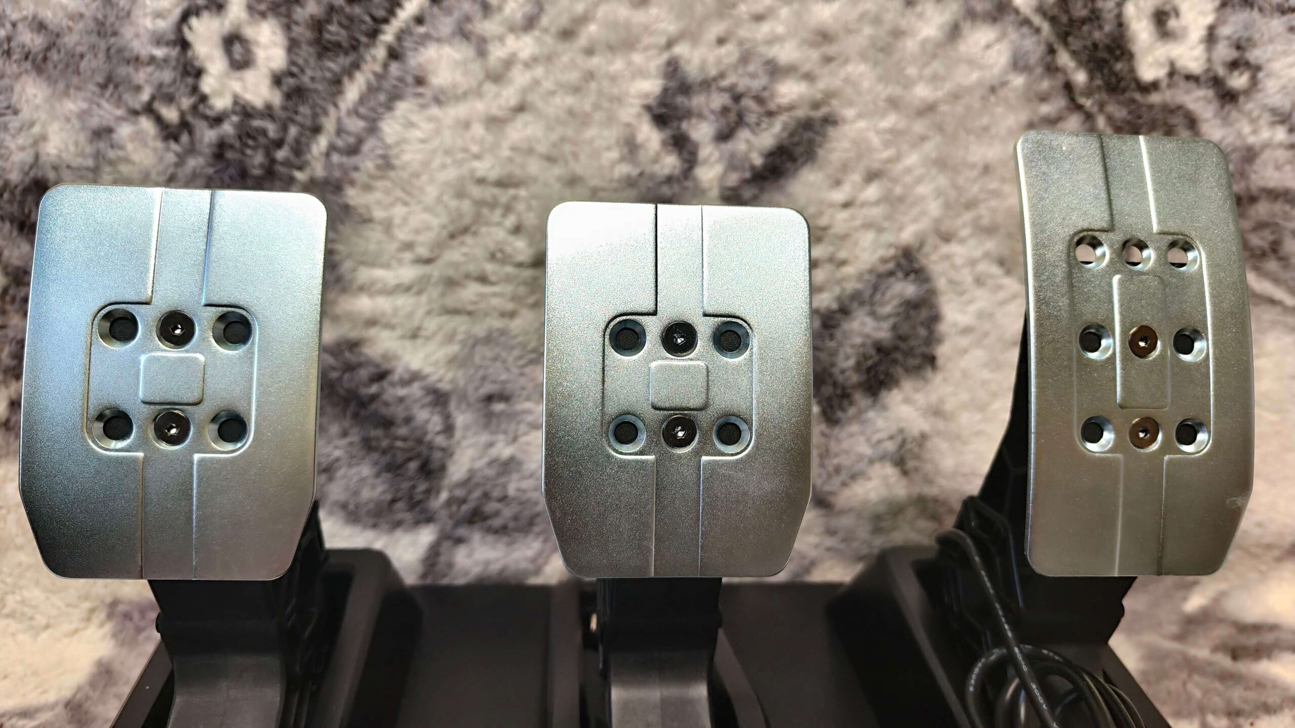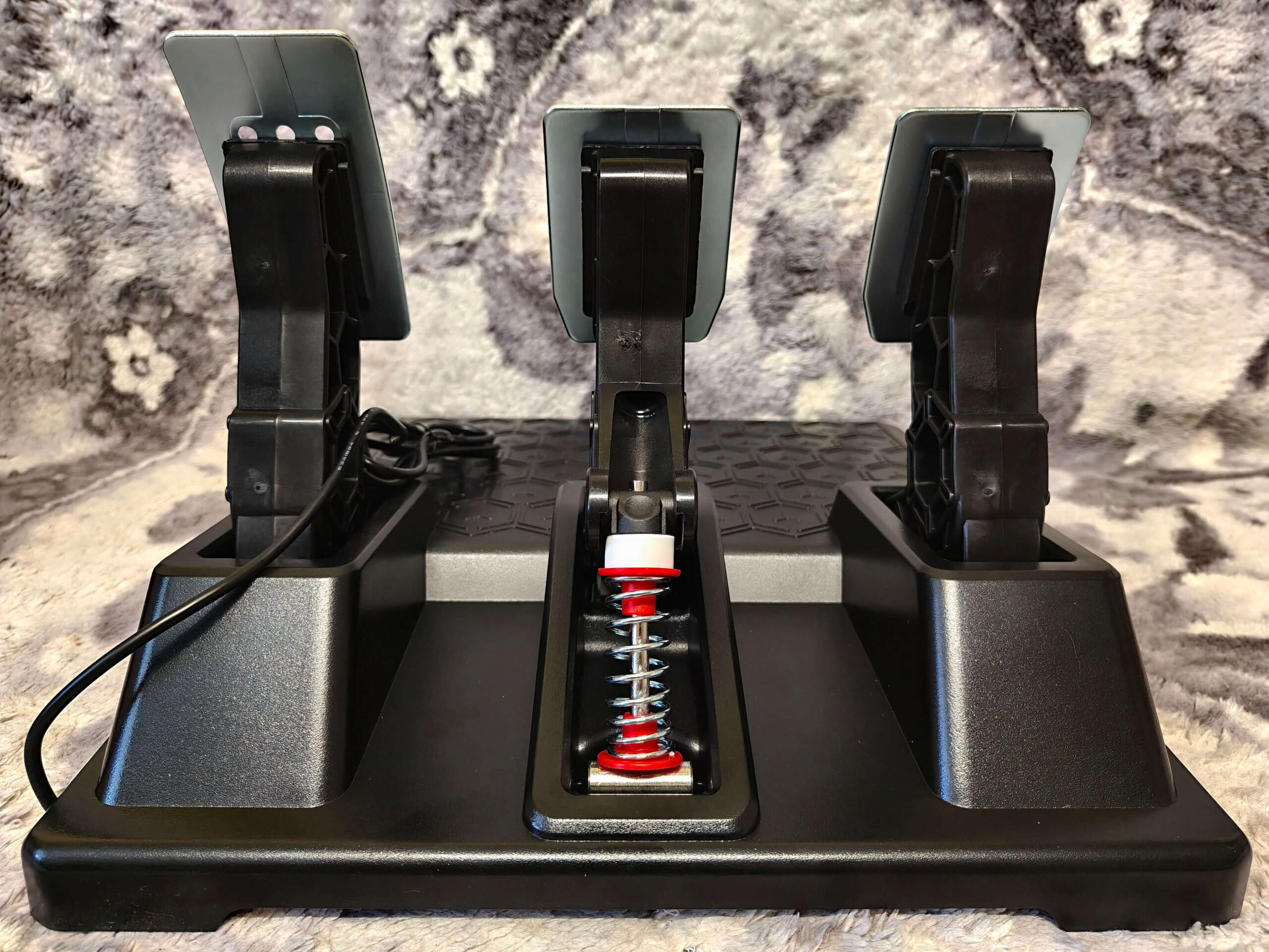 Do kierownicy Thrustmaster T248R dołączony niestety stary już panel pedałów T3PM. Stary, jednak nie znaczy zły. Manipulatory nożne wyposażono technologię magnetyczną H.E.A.R.T. Zapewnia ona wyjątkową precyzję i błyskawiczną reakcję na nacisk liczoną w tysięcznych częściach sekundy. Nakładki są metalowe niestety całe ramiona już plastikowe. Wspomniałem, że w kartonie znajdziemy dodatkową sprężynę do pedału hamulca. Domyślnie zamontowana jest srebrna, twarda, która przykładowo dla młodszych graczy może stawiać zbyt duży opór w hamowaniu. Dlatego warto będzie wymienić ją na czarną, która wymaga zdecydowanie mniejszej siły nacisku. Regulować możemy nie tylko opór pedałów, ale także ich rozmieszczenie. W tym celu należy odkręcić metalową stopkę, aby przestawić oczka w pozycji pionowej lub poziomej. Bez problemu możemy zmienić także kąt nachylenia pedałów – odkręconą stopkę obracamy o 180 stopni i ponownie przykręcamy.