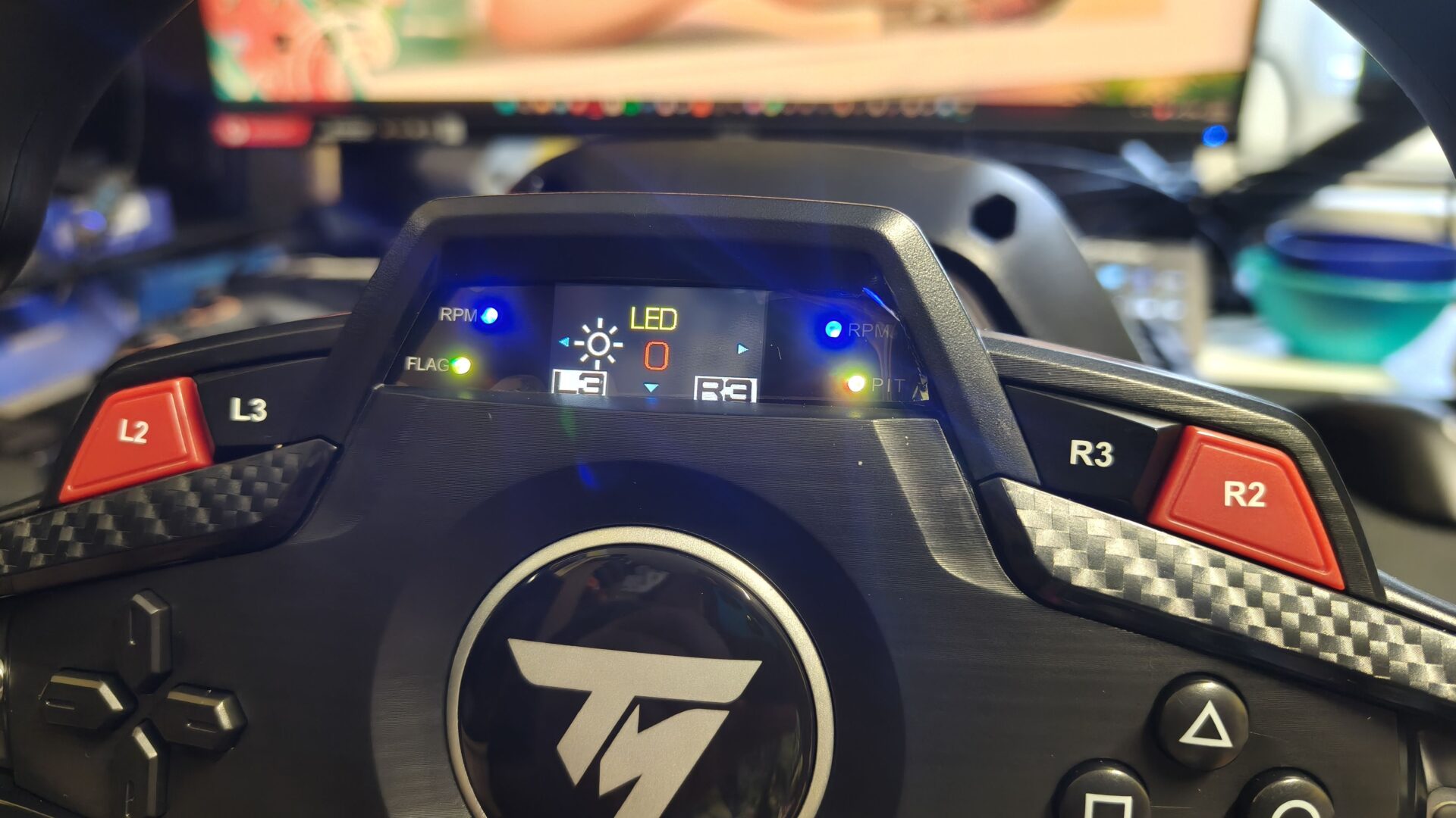 Nowy wyświetlacz LCD w T248R to największa zmiana względem T248, która miała ekran monochromatyczny (czarnobiały). Przycisk MODE służy tylko do wyboru platformy, na której chcemy grać. Mode 1 to PS5, Mode 2 to PS4, a PC wiadomo. Cała magia ustawień nowego wyświetlacza ukryta jest teraz pod przyciskiem z zębatką. Naciskając zębatkę, zobaczymy na ekranie dwa duże przyciski: L3 i R3. Pierwszy jest od ustawień kierownicy, drugi od wyświetlanych parametrów w czasie wyścigu. Zacznijmy od możliwości wizualnych, możemy wybrać wyświetlacz dla bolidów lub samochodów sportowych. Następnie możemy wyświetlić prędkość razem z wrzuconym biegiem. Dalej jest liczba okrążeń, pozycja, czas okrążenia i obroty silnika. Razem do dyspozycji gracza jest 20 dostępnych ekranów i 4 diody, które na bieżąco przekazują nam takie informacje o wyścigu.