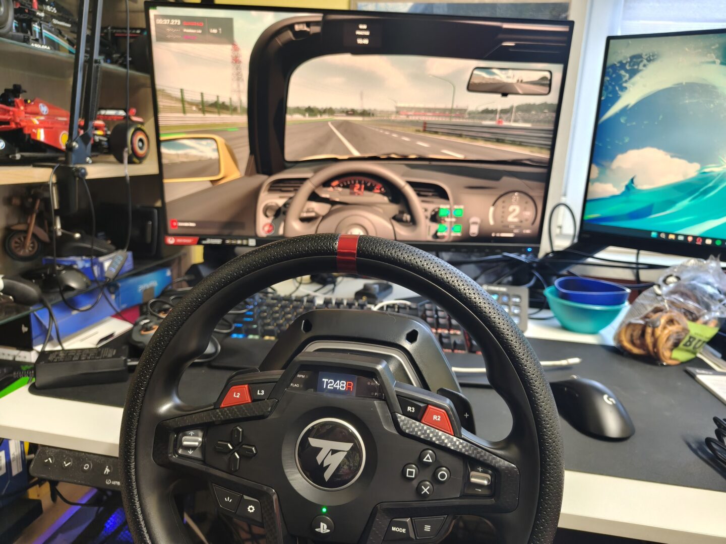 Nie ulega wątpliwości, że głównymi odbiorcami tej kierownicy będą posiadacze konsol PlayStation. Thrustmaster T248R świetnie sprawdza się jako kierownica do Gran Turismo 7. Niestety recenzowanego modelu nie znajdziemy w menu ustawień gry. Konsola uważa, że ​​jest to starszy model T-GT. Na szczęście okazało się, że niemal wszystko, czego gracz potrzebuje, było odpowiednio przypisane. Sam musiałem przypisać dwa srebrne przyciski do funkcji MFD. Jednak nie jest to konieczne, gdyż MFD domyślnie już jest przypisane do DPada. Po prostu ustawienie MFD na dwa srebrne przyciski pozwala wam sterować przykładowo kontrolą trakcji lub mieszanką paliwową za pomocą dwóch kciuków zamiast jednym.