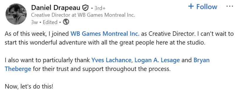 Post na LinkedIn nie zdradza zbyt wiele i skupia się przede wszystkim na WB Games Montreal, niż na studiu, które zostawił za sobą.