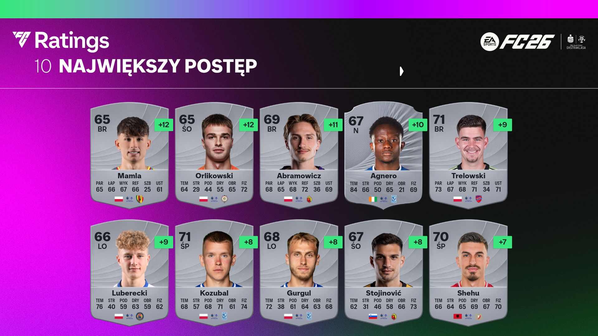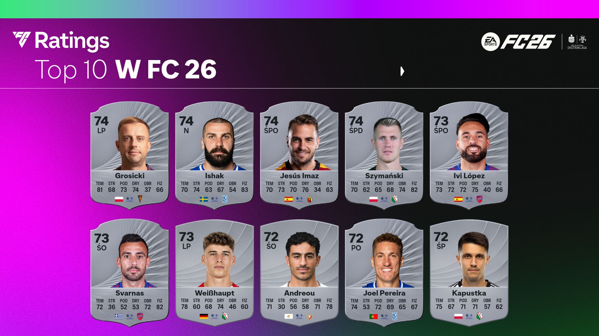 Od początku tygodnia EA SPORTS ujawnia kolejne karty piłkarzy razem z ocenami w EA SPORTS FC 26. Dziś przyszedł czas na najlepszą ligę świata – PKO Bank Polski Ekstraklasa. Najwyższymi ocenami mogą pochwalić się Kamil Grosicki (Pogoń Szczecin), Mikael Ishak (Lech Poznań). Do tego Jesús Imaz (Jagiellonia Białystok) oraz Sebastian Szymański (Legia Warszawa). Wszyscy otrzymali ocenę ogólną na poziomie 74 punktów. Z kolei największy postęp zaliczyli Rafał Mamla (Korona Kielce) i Igor Orlikowski (Zagłębie Lubin). Obaj zyskali aż 12 punktów do oceny ogólnej, otrzymując karty z oceną na poziomie 65.