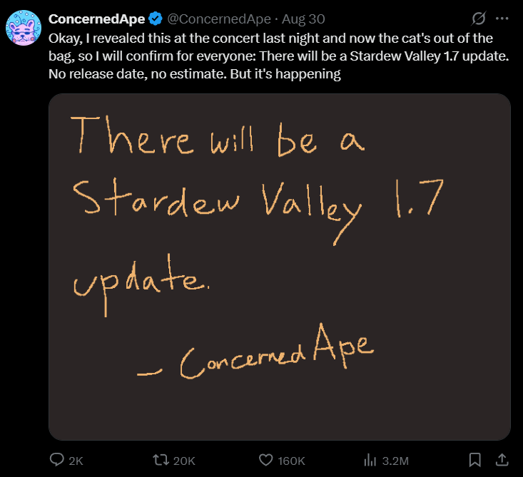Fani dostali także zapewnienie, że pomimo pracy nad swoim nowym projektem, Haunted Chocolatier, Barone będzie dalej rozwijał Stardew Valley.