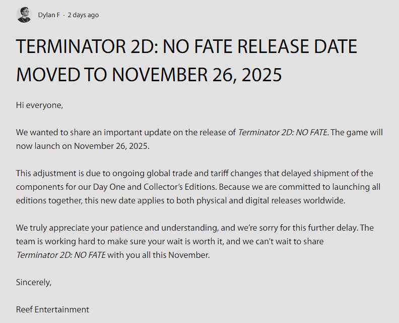 Studio Reef Entertainment niedawno ogłosiło informację dotyczącą gry Terminator 2D: No Fate. Jak możecie pamiętać, produkcja ta miała trafić na konsole i komputery na początku września. Termin ten zmieniono na końcówkę października, a ostatnio jeszcze raz – na końcówkę listopada. Niżej możecie przeczytać treść obwieszczenia w tym temacie: