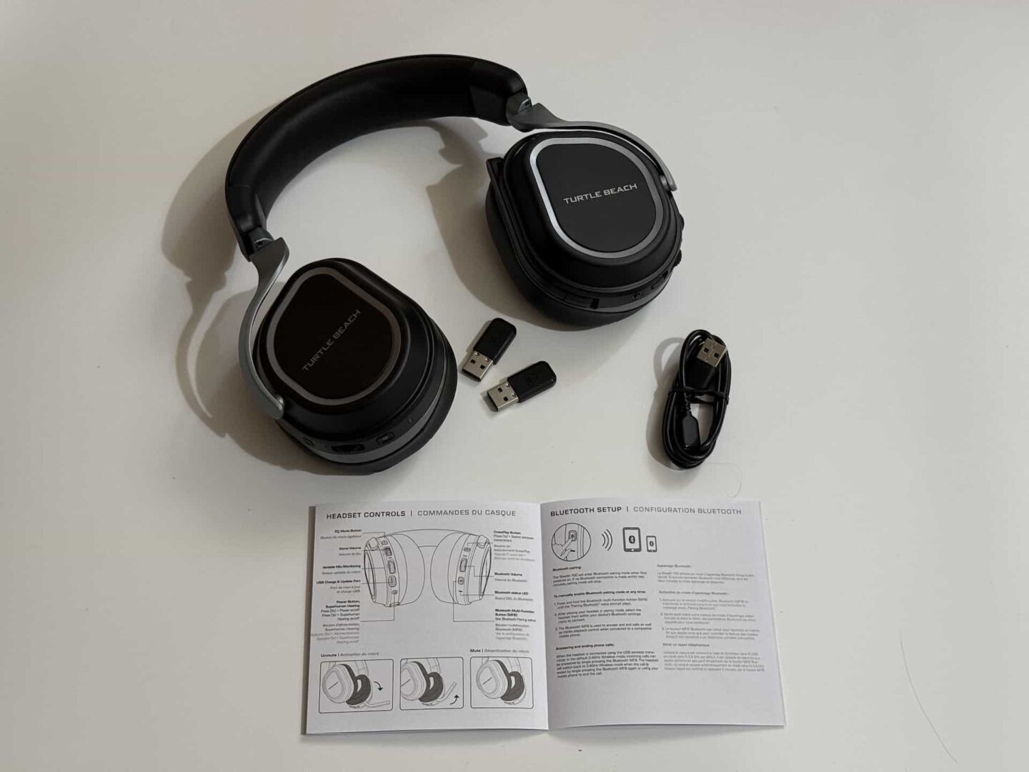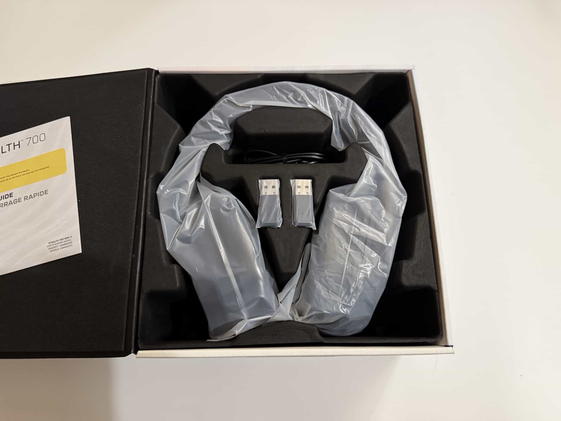 Firma postarała się, by słuchawki już na etapie odpakowania prezentowały się jako produkt premium. Po otwarciu pudełka naszym oczom ukazuje się bowiem ładnie zapakowany headset wraz z dwoma odbiornikami oraz przewodem do ładowania USB-A do USB-C. Zestaw jest kompletny, a co ważniejsze, gotowy do grania.