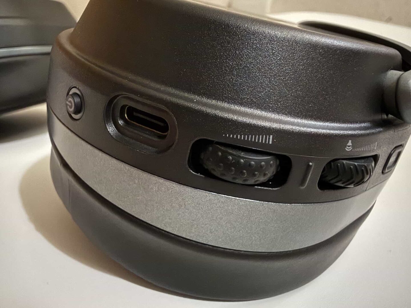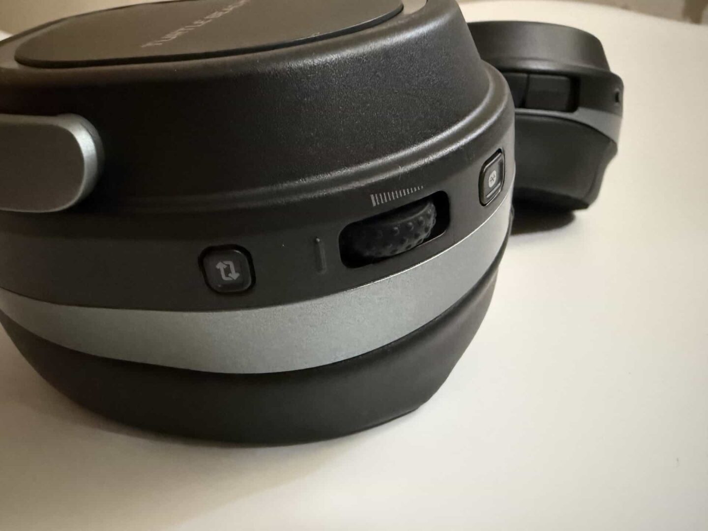 No dobrze, ale co owe pokrętła robią? Dolne na lewej słuchawce jest odpowiedzialne za głośność odtwarzania ze źródeł 2,4 GHz. Pozycja ta jest niestety niefortunna – zdarzało mi się przypadkiem podkręcić dźwięk na pełny regulator przypadkowym otarciem słuchawek o bark. Górne pokrętło lewej muszli służy do regulacji głośności odsłuchu własnego głosu w mikrofonie. Na prawej słuchawce mamy natomiast regulację głośności dźwięku ze źródła Bluetooth.