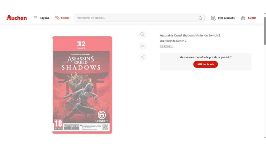 Konsola Nintendo Switch 2 to sprzęt o zaskakująco wysokiej wydajności. Oczywiście tworząc porty gier na tę platformę, trzeba się liczyć z pewnymi ograniczeniami. Mimo tego tytuły takie jak Star Wars: Outlaws czy Cyberpunk 2077: Ultimate Edition potrafią świetnie wyglądać i działać na tej konsoli. Szczególnie mam na myśli historię V w Night City, która moim zdaniem jeszcze długo będzie mogła być benchmarkiem dla kolejnych gier. Być może jedną z nich będzie Assassin’s Creed Shadows. Jak bowiem informuje serwis Eurogamer, w ofercie francuskiej strony Auchan pojawiło się wydanie dedykowane Nintendo Switch 2. W momencie pisania newsa strona nie ma już widocznej odsłony na NS2. W internecie jednak nic nie ginie. Można znaleźć poniższą grafikę: