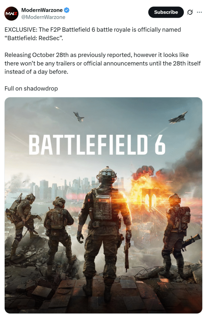 O tym, że w Battlefield 6 pojawi się tryb Battle Royale wiemy już od kilku miesięcy. DICE zamknął aktualnie Battlefield Labs, a według plotek, Battlefield: RedSec pojawi się już w przyszły wtorek. Aż do tego dnia nie zobaczymy oficjalnie żadnej zapowiedzi, ani zwiastuna.