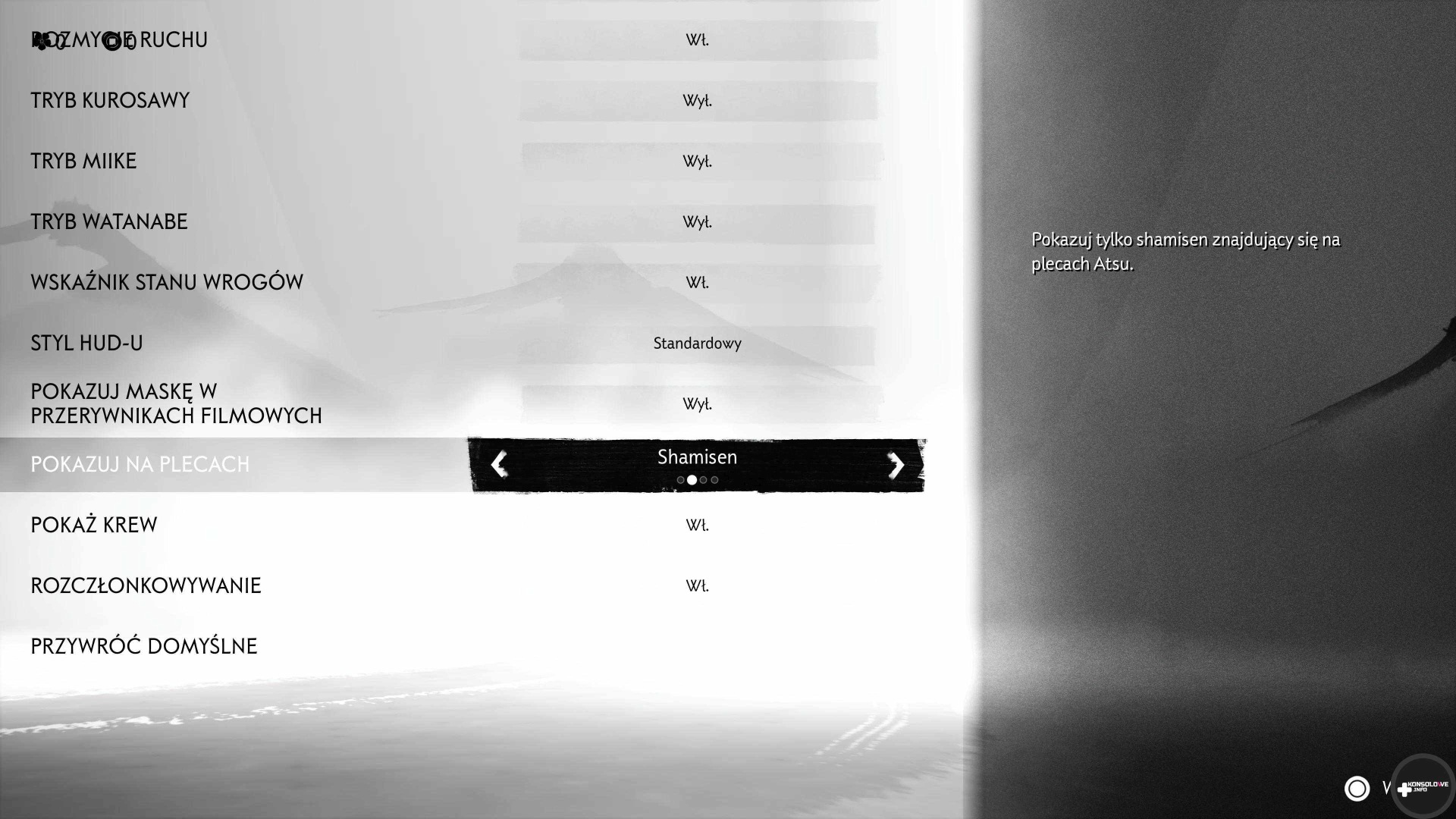 Ghost of Yotei oferuje kilka trybów działania i wyświetlania obrazu. Zdecydowanie należy poświęcić im nieco uwagi, bo są w stanie istotnie wpłynąć na nasze postrzeganie gry. Jednym z nich jest, znany już z Ghost of Tsushima, tryb Kurosawy. Możemy w nim cieszyć się japońskimi głosami postaci, polskimi napisami i charakterystyczną czarno-białą, miejscami nieco „szarpaną”, taśmą (jak w latach 50-tych). Z pewnością zainteresuje to miłośników twórczości tego reżysera. Oprócz tego znajdziemy tryb Watanabe. Nazwa pochodzi oczywiście od operatora filmowego, Kenjiego Watanabe. Kamera jest tu bardziej statyczna i filmowa – przejścia są wolniejsze, a pole widzenia mniejsze. Ponadto zablokowano klatki na 30 oraz uwydatniono rozmycie ruchu.