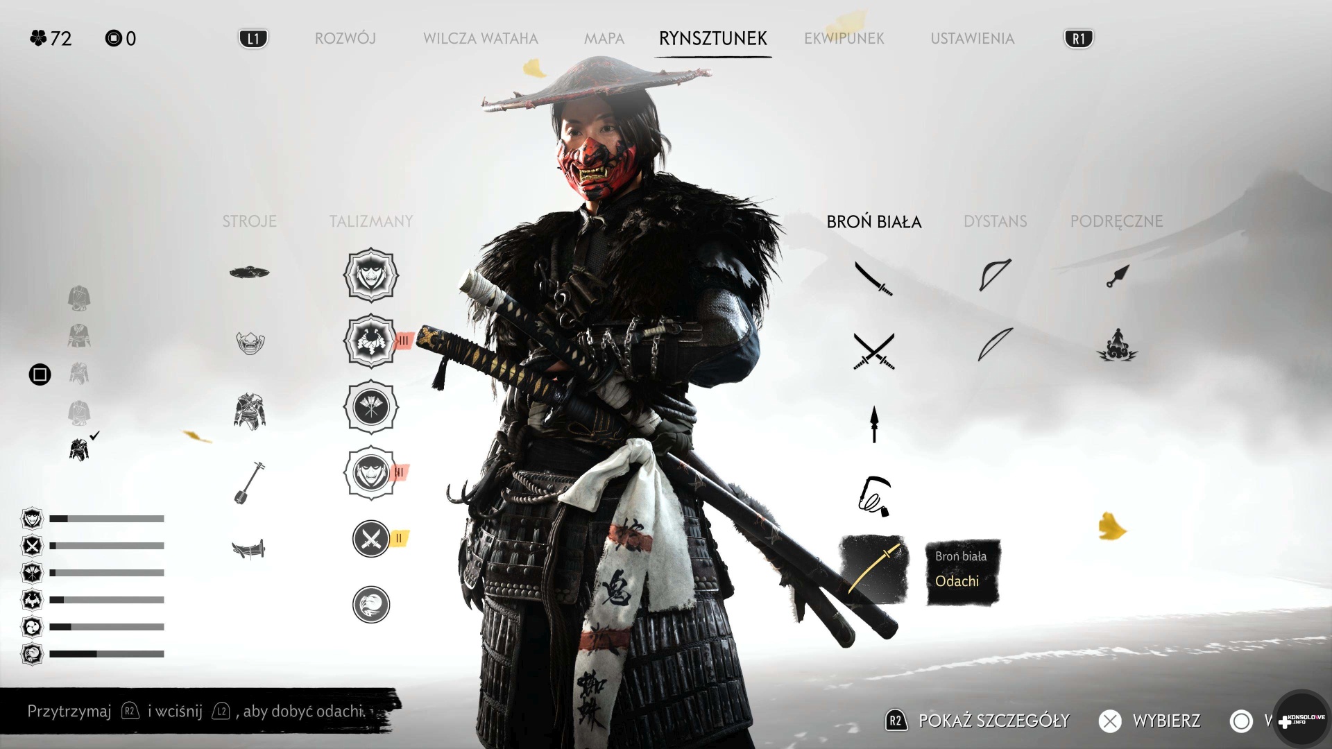 Jeżeli graliście w Ghost of Tsushima, to z pewnością pamiętacie system walki z tamtej produkcji. Opierał się on na różnych postawach, które trzeba było odpowiednio wybrać zależnie od broni, z jakiej korzystał adwersarz Jina. W Ghost of Yotei nie ma takiego przełączania postaw. Zamiast tego Sucker Punch stawia na dobór odpowiedniej broni względem przeciwnika. W miarę postępów fabularnych odblokujemy kilka typów oręża. Nie będę przybliżał Wam wszystkich rodzajów, ale wspomnę o kilku. Naszym podstawowym narzędziem mordu jest katana. Nie minie wiele czasu, a nauczymy się władać dwiema katanami. W perspektywie są także chociażby kusarigama i yari. Możemy wykonywać zarówno ataki szybkie (choć oczywiście słabe), jak i ładowane – silniejsze, aczkolwiek wystawiające nas na atak przeciwnika. Warto jeszcze wspomnieć, że wykonując silny atak w odpowiedzi na właściwy rodzaj ciosu wroga (oznaczony pomarańczową poświatą), możemy go rozbroić.