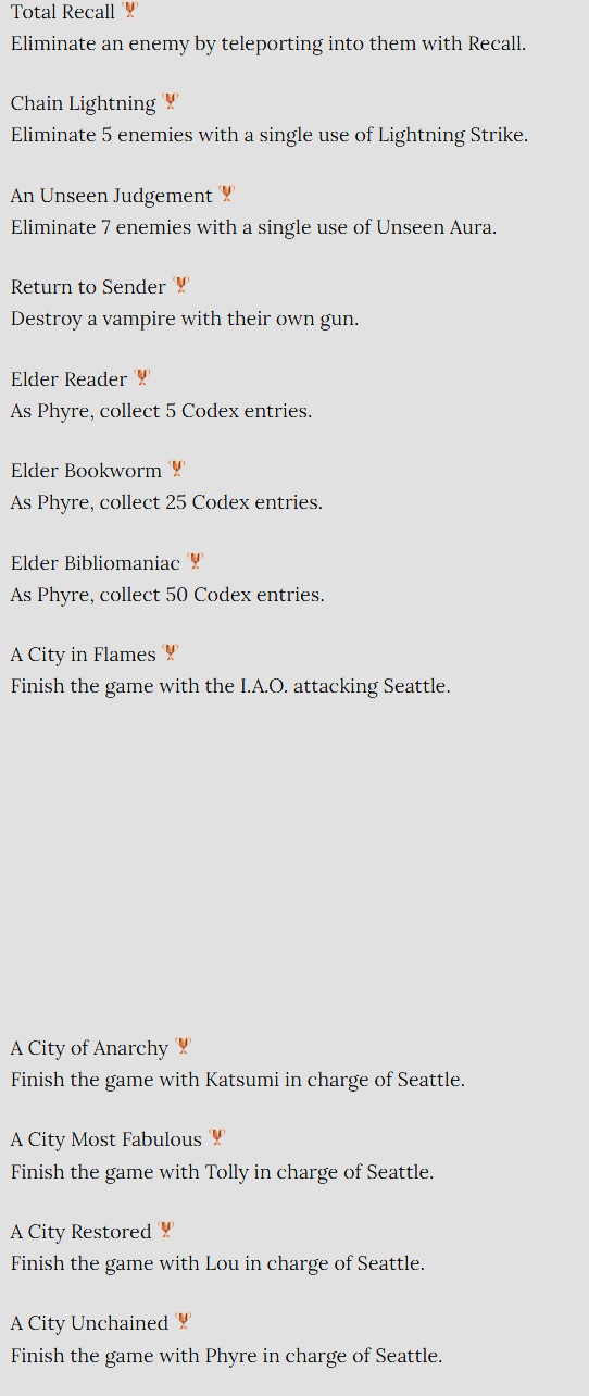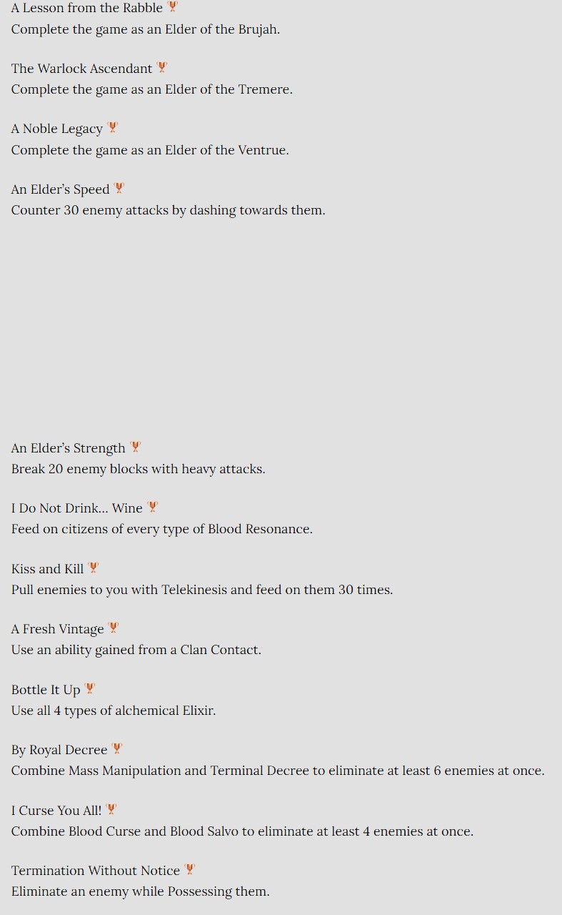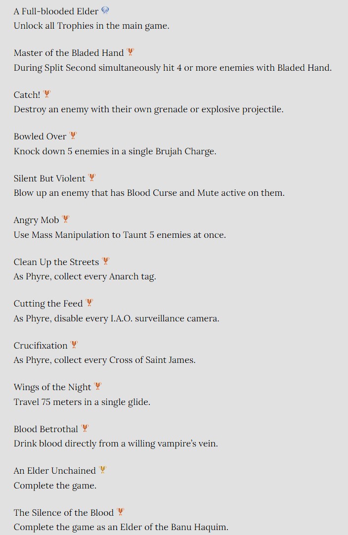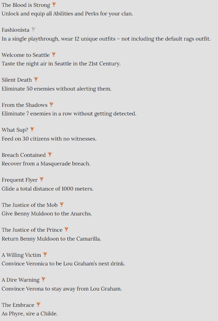 Już za 5 dni ukaże się Vampire: The Masquerade – Bloodlines 2. Jeśli zamierzacie zdobyć wszystkie trofea, czy osiągnięcia (zależnie od platformy), to czeka Was niemałe wyzwanie. Okazuje się bowiem, że trzeba będzie przejść grę co najmniej 6 razy, jako każdy z dostępnych klanów. Ponadto niezbędne będzie osiągnięcie konkretnego zakończenia. Nie wiadomo co prawda, w jakim stopniu nasze decyzje z całej rozgrywki będą wpływały na dostępność wariantu finału. Nie sposób jednak nie zgodzić się, że niezbędne będzie parokrotne kończenie gry. Oczywiście nie brakuje też odznaczeń za odpowiednie korzystanie ze specjalnych mocy. Co jest jednak, moim zdaniem bardziej interesujące, to możliwość przyjęcia pod swoje skrzydła wampirzego wychowanka, którego prawdopodobnie będziemy musieli wcześniej przemienić. Ponadto będziemy mogli stanąć na czele Seattl i klanów. Niżej możecie zapoznać się z pełną listą trofeów: