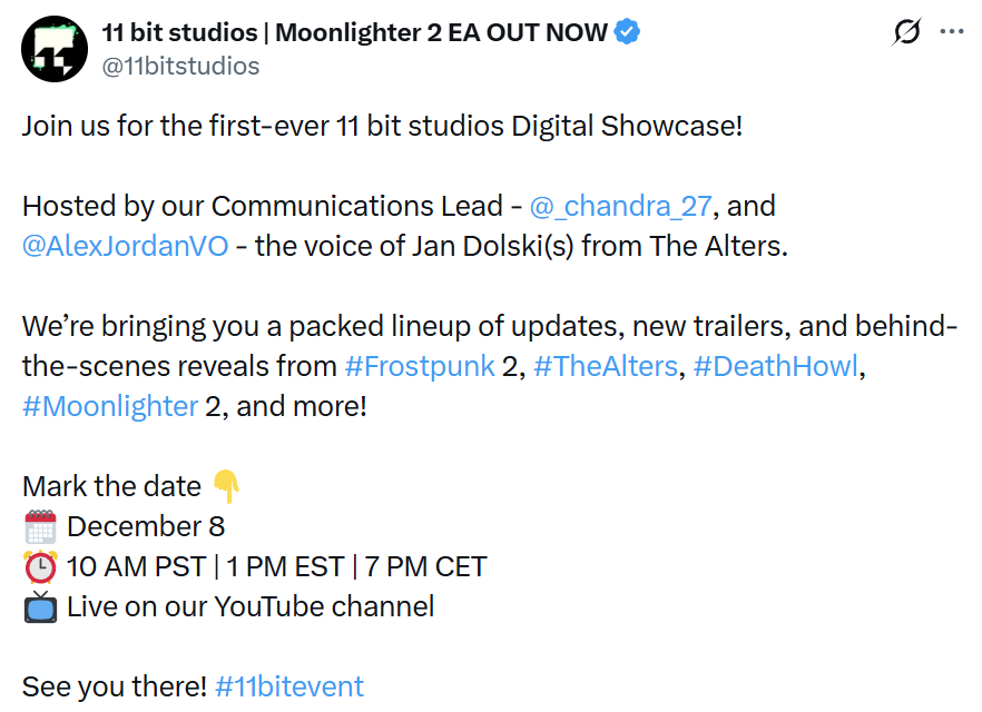 11 bit to polskie studio i wydawnictwo, które od lat już raczy nas świetnymi tytułami. To właśnie oni odpowiedzialni są za jeden z najbardziej rozpoznawalnych tytułów poza światem gier, czyli This War of Mine. (Jak może pamiętacie, jest to pierwsza gra, która trafiła na listę lektur szkolnych!). Oprócz tego stworzyli także serię Frostpunk oraz nominowaną do The Game Awards grę the Alters. Już w następny poniedziałek dowiemy się więcej o ich aktualnych grach, a także zobaczymy zwiastuny nowości. Wszystko to w ramach 11 bit studios Digital Showcase.
