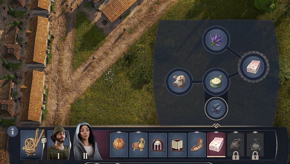 Wyboru budynków dokonujemy, klikając ikonkę interesującego nas produktu końcowego. Jeśli do stworzenia go potrzeba łańcucha produkcji, tutaj będzie jego podgląd.