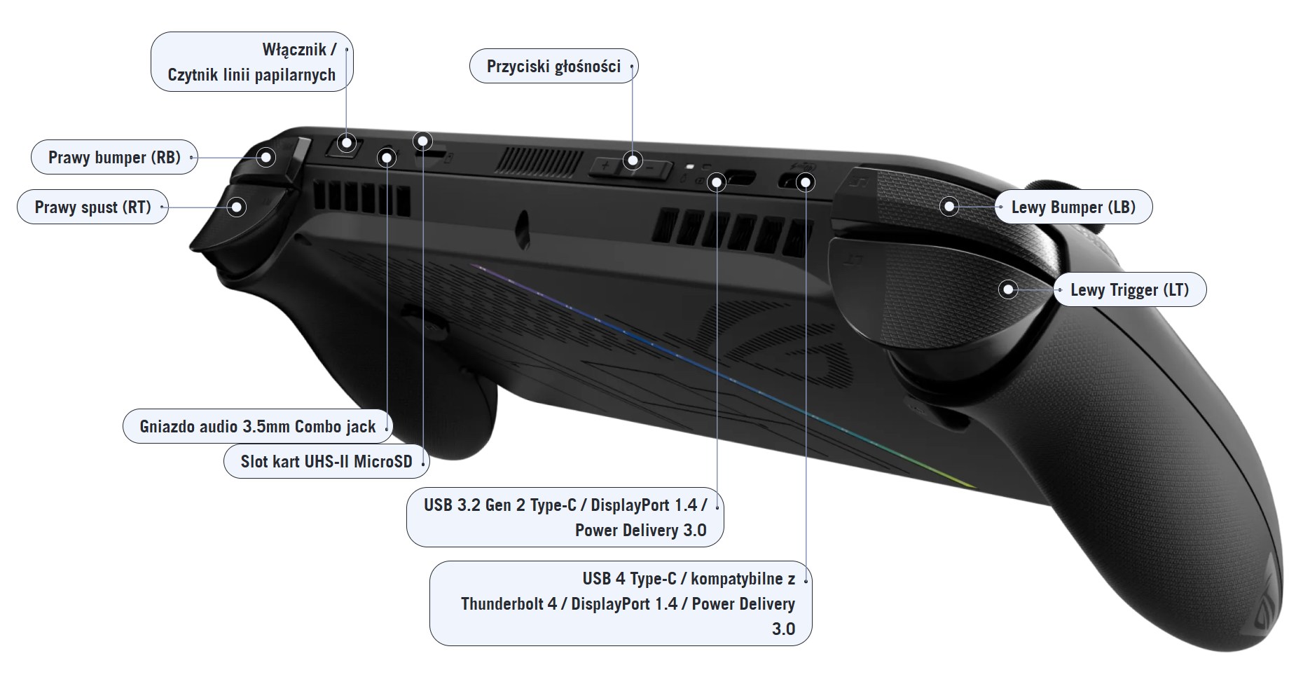 ROG XBOX ALLY X obsługuje z łączności bezprzewodowej Wi-Fi 6E(802.11ax) (Triple band) 2*2 oraz technologię Bluetooth 5.2. Natomiast jeżeli chodzi o dostępne porty, to zdecydowano się na umieszczenie: