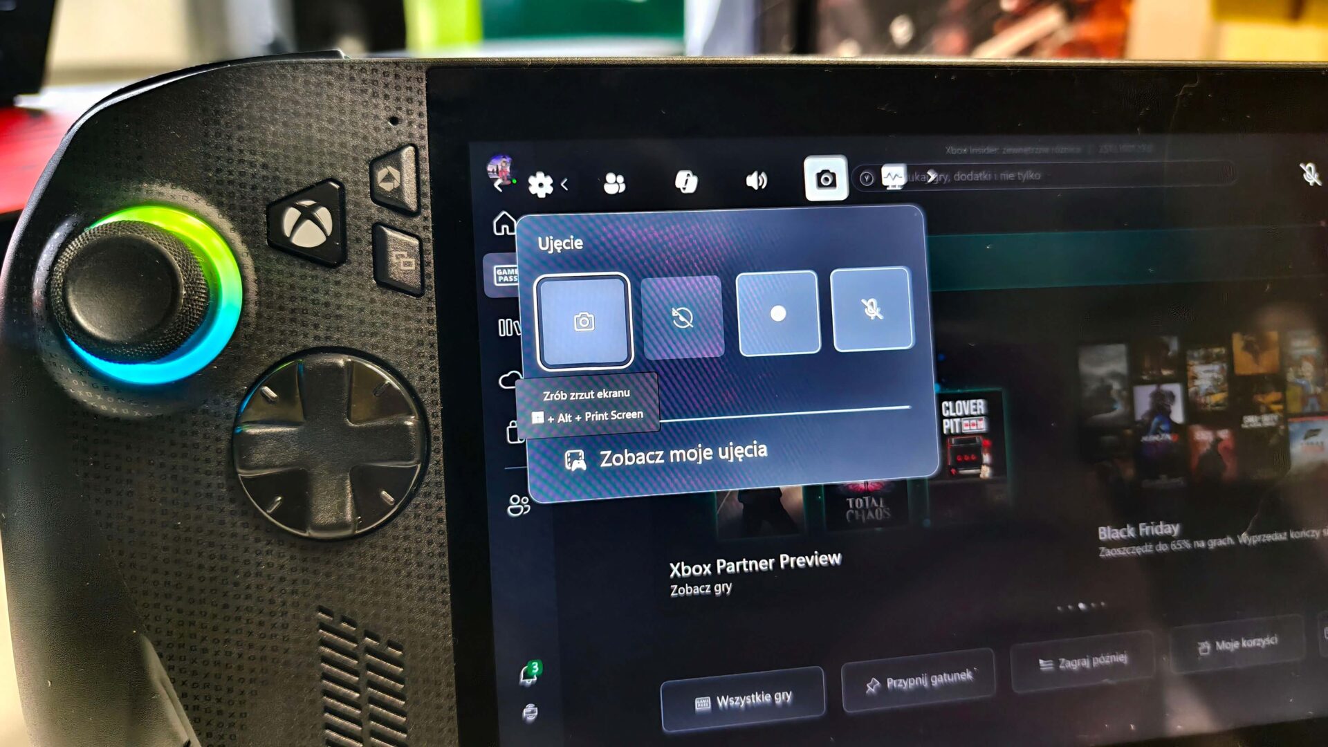 Jedną z przyjemniejszych funkcji, jaką znajdziemy na konsolach względem pecetów, jest szybkie i proste zapisywanie zrzutów ekranu oraz nagrywanie rozgrywki bez konfiguracji żadnego oprogramowania. Na konsoli zazwyczaj wystarczy nacisnąć raz odpowiedni przycisk, aby wykonać zrzut ekranu, a przytrzymać go, aby zapisać ostatnie minuty lub nacisnąć dwa razy, aby rozpocząć nagrywanie. ROG XBOX ALLY X nie ma przycisku od multimediów., To przenośny pecet, więc wszystko tu musi być zrobione po… komputerowemu. Aby wykonać zrzut ekranu, musimy nacisnąć przycisk Xbox, który wywoła nam Centrum Poleceń. Następnie PIĘĆ razy naciskamy RB, aby dostać się do zakładki Ujęcie. Zobaczymy tu wirtualny przycisk od screenów, nagrywania rozgrywki, czy włączenia i wyłączenia mikrofonu.