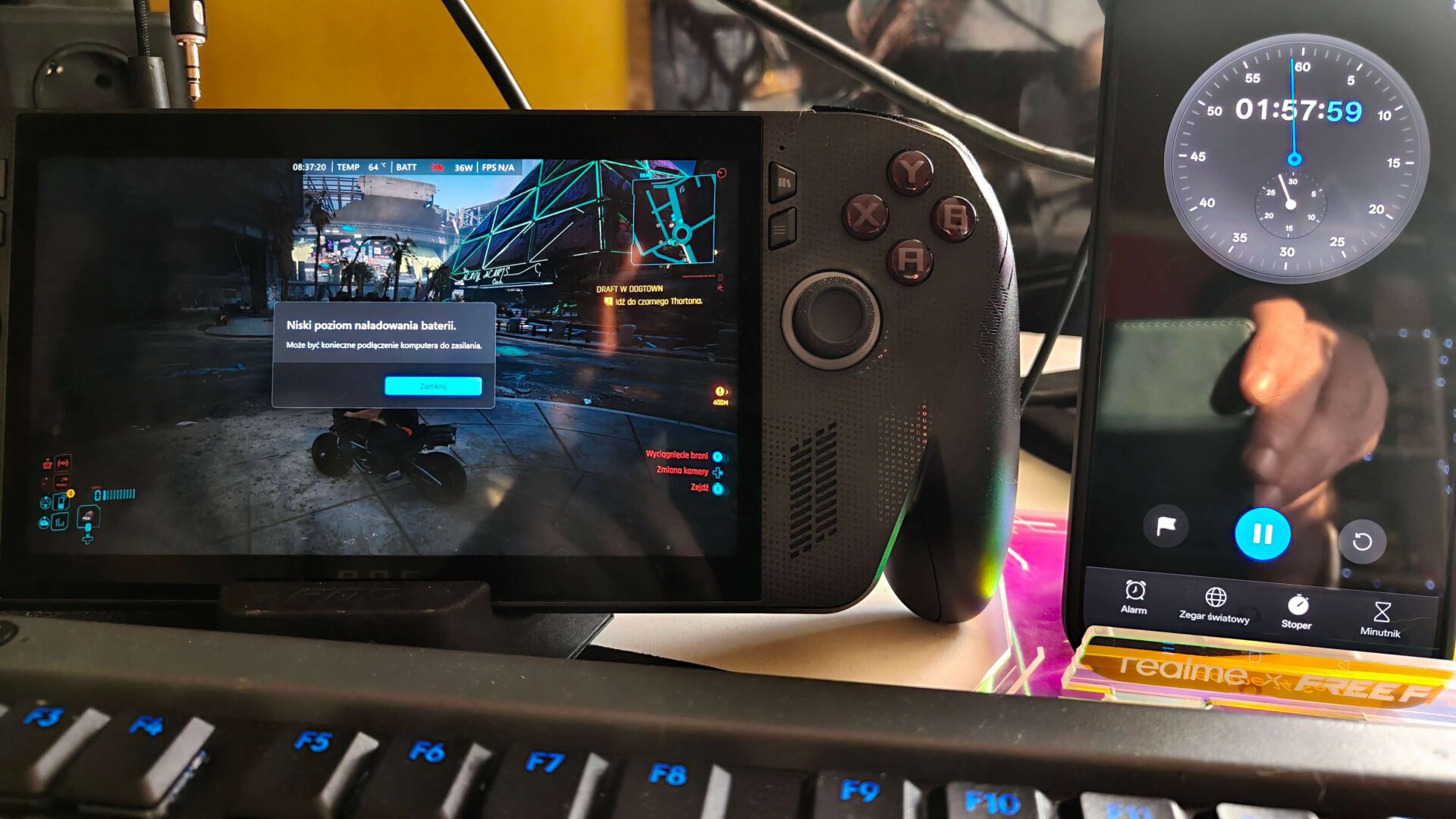 ROG Xbox Ally X otrzymał ogromną baterię 80 Wh. W zależności od odpalonej gry AAA, ustawionej jasności oraz trybie pracy średnio urządzenie powinno działać od 1,5 do dwóch godzin. Oczywiście sam wykonałem kilka testów. M.in. odpaliłem Cyberpunk 2077 w trybie Turbo 25 W (wysokie detale, 1080p, duży ruch) i zostawiłem konsole włączoną patrząc, jak żyje świat na ulicy. 60 minut grania zabiera 45% baterii. 90 minut grania zostawia 30% baterii. 10% baterii zostało po godzinie i 50 minutach. W Clair Obscur: Expedition 33 na wysokich detalach przy rozdzielczości 1080p mogłem grać przez niemal dwie godziny. Postanowiłem również wycisnąć z baterii największą ilość czasu. Ustawiłem tryb cichy 13 W, jasność ekranu dałem na 50%, odpaliłem Hollow Knight: Silksong i mogłem grać przez ponad cztery godziny.