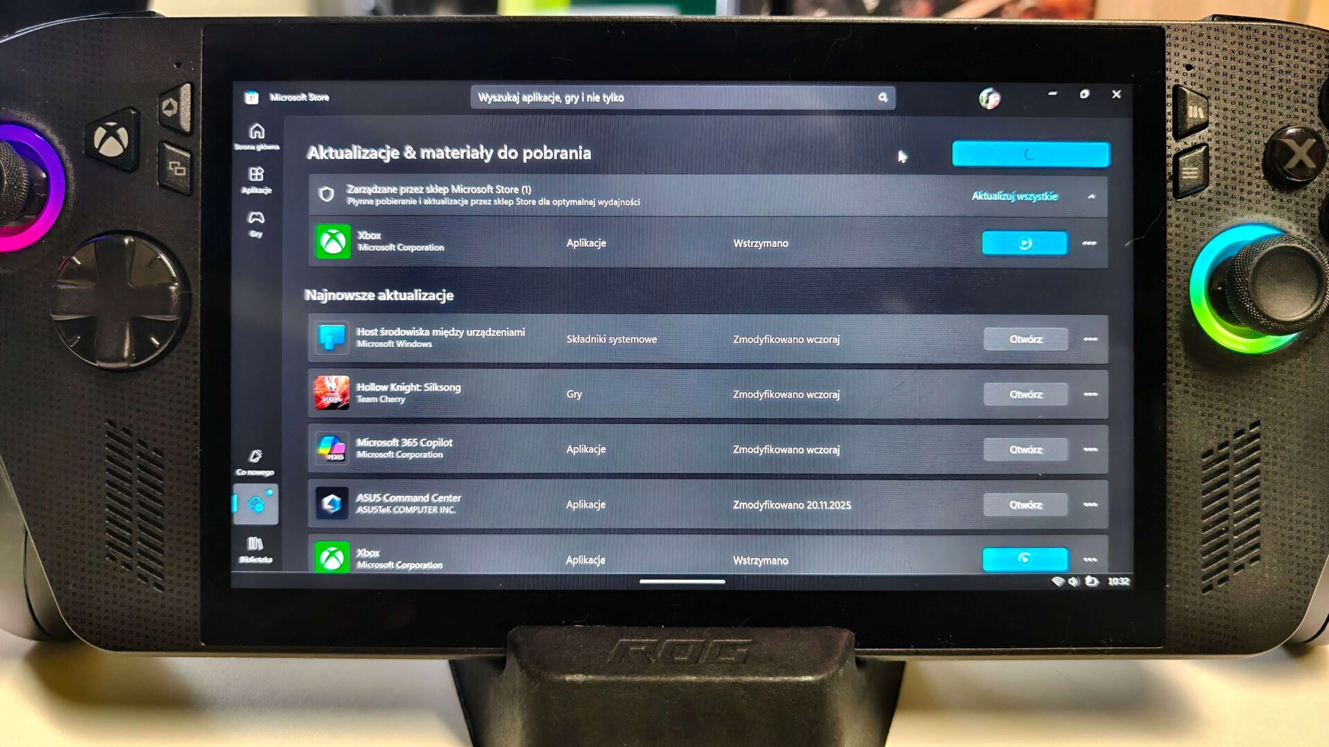 Pierwsze piętro to oczywiście instalowanie wszystkich aktualizacji systemu Windows. Drugie piętro to instalowanie wszystkich aktualizacji z Armoury Crate SE. To taki duży menadżer urządzenia ROG XBOX ALLY X, który służy m.in. do pobierania sterowników oraz aktualizowania najważniejszych aplikacji do obsługi urządzenia. I wreszcie trzecie piętro to instalowanie aktualizacji z Microsoft Store. To tam aktualizujemy gry, czy aplikacje takie jak Xbox.