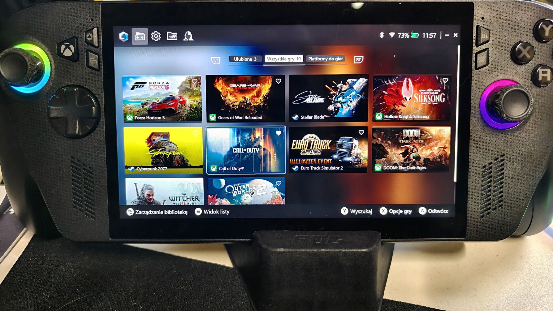 Jestem z krwi i kości konsolowcem, a więc starałem się testować wszystkie gry w domyślnych ustawieniach przygotowanych przez optymalizację urządzenia. Instaluję grę i uruchamiam bez zaglądania do ustawień – tak, jakbym to robił na konsoli. Wychodzę z założenia, że tak zrobi większość użytkowników, którzy kupią sobie ROG XBOX ALLY X. Na dysku SSD o pojemności 1 TB zmieściłem 10 gier, kilka z Xbox Game Pass i kilka z mojej kolekcji na Steam. Sprawdzałem m.in. takie tytuły jak ostatnio wydane Call of Duty: Black Ops 7, Cyberpunk 2077, DOOM: The Dark Age, czy Stellar Blade. Każda z tych gier bez wątpienia wymaga mocnego peceta do grania nawet w 1080p. Jednak ROG XBOX ALLY X poradził sobie z nimi bez większych problemów, oferując przyzwoitą grafikę oraz, co ważne, wydajność na wysokim poziomie.