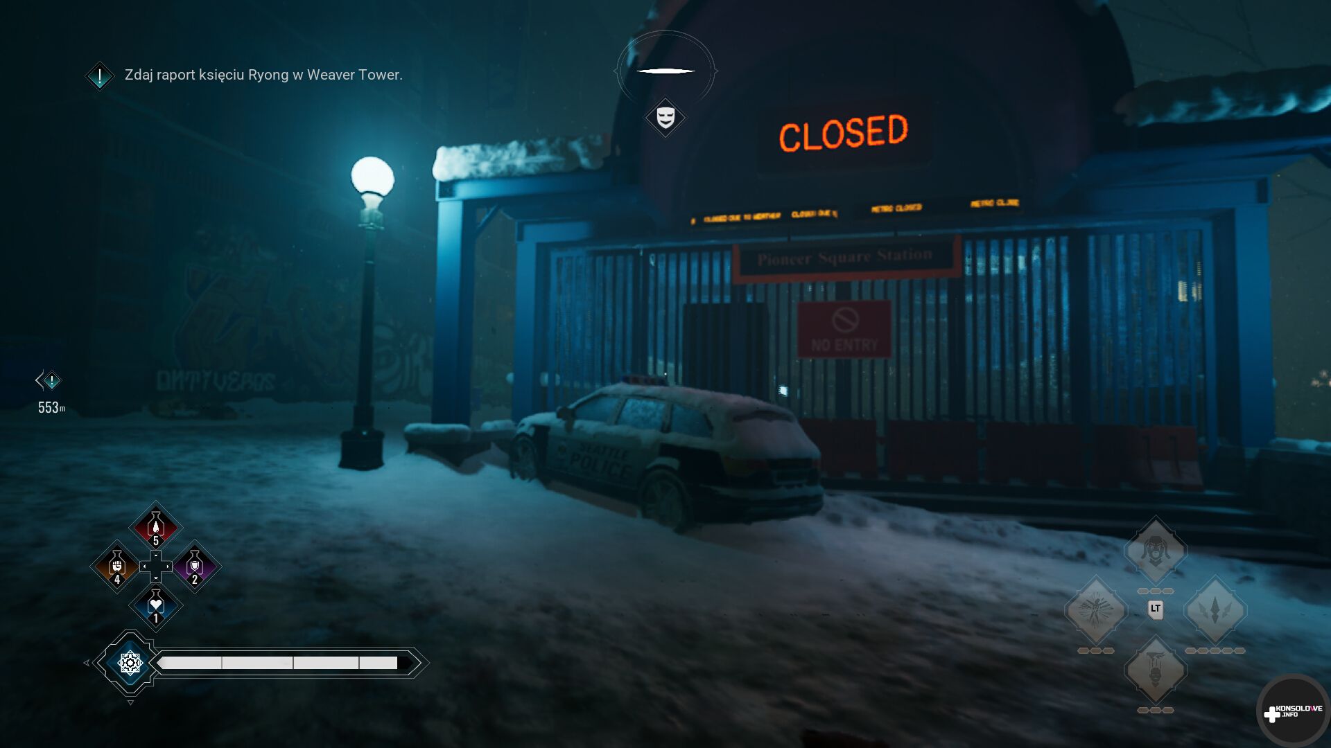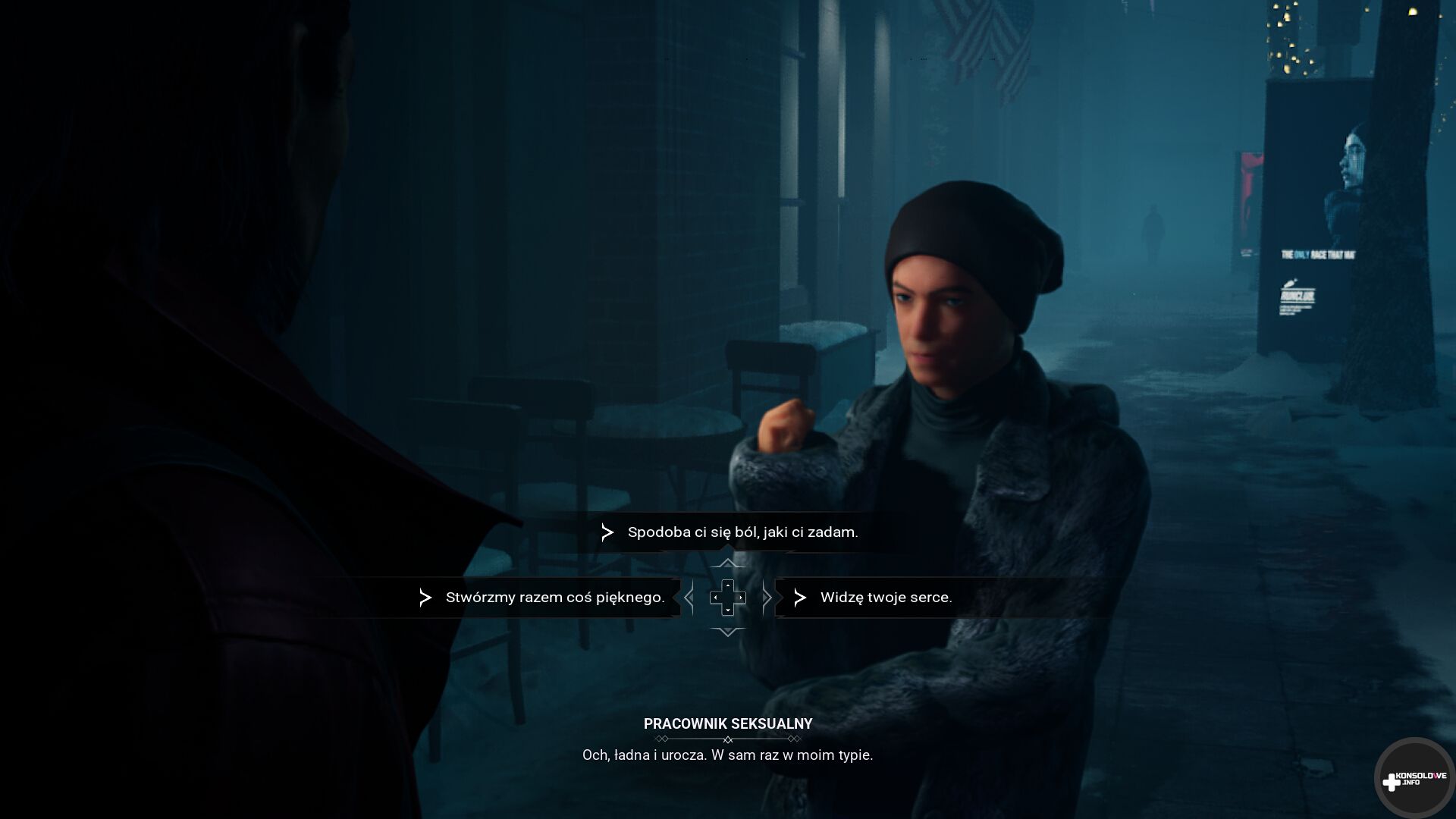 Grafika jest zresztą dość trudna w ocenie. Stronie wizualnej nie mogę odmówić bardzo sprawnego operowania światłem i cieniem. Czy to przemierzając kluby nocne, czy opuszczone mieszkania, czy szybując między dachami Seattle możemy natknąć się na zachwycające więc lokacje. Nie sposób tu nie wspomnieć również o rezydencji Lou Graham. Obsypane śniegiem Seattle (gra dzieje się kilka dni przed świętami Bożego Narodzenia) w zestawieniu z neonami i ozdobami świątecznymi buduje bardzo sugestywny klimat, który chce się chłonąć.