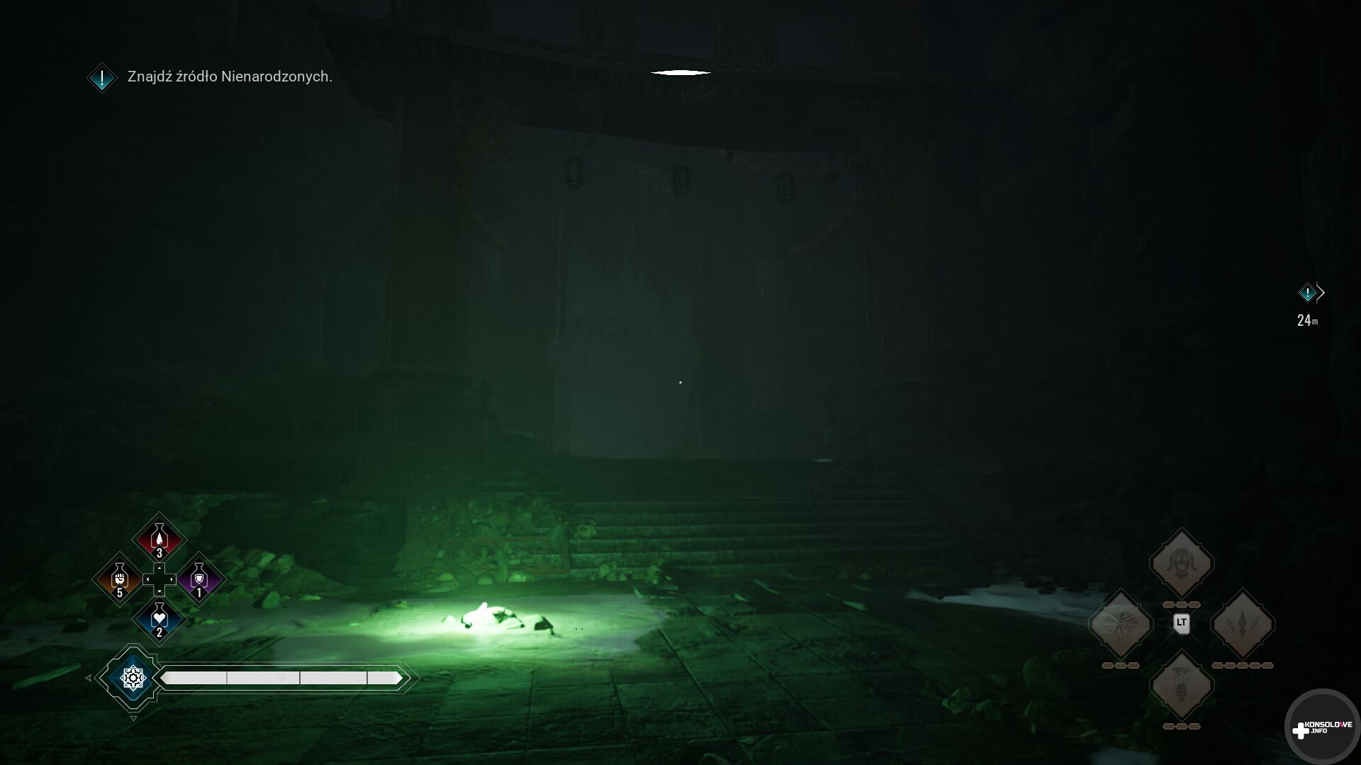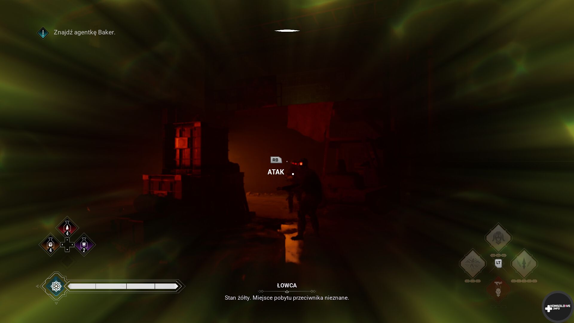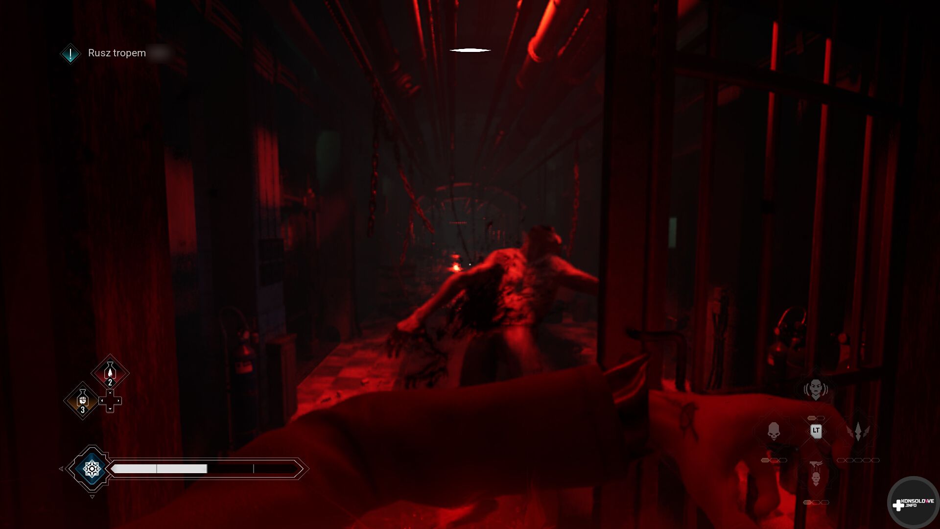 Za pomocą telekinezy pochwycimy pobliską butelkę i ciśniemy nią w wybrane miejsce, aby odciągnąć uwagę oponenta. Gdy będzie w odpowiednim miejscu, możemy się za nieco przekraść i zdjąć go szybkim ataku kończącym (za pomocą przycisku X na padzie). Alternatywnie możemy przytrzymać oba spusty, aby wgryźć się w tętnicę i wypić krew wroga. Ten ruch jest dużo głośniejszy niż zwykłe wykończenie, ale też dodaje nam punkty krwi. Te są niezbędne do korzystania ze specjalnych umiejętności.