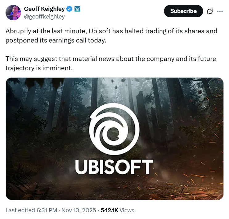 Geoff Keighley parę godzin temu opublikował na Twitterze informację, że Ubisoft strzymał sprzedaż akcji, a także w ostatniej chwili opóźnił spotkanie prezentujące wyniki finansowe. Nic nowego jednak od tej chwili się nie pokazało. Czyżby jutro czekały nas jakieś wielkie informacje?