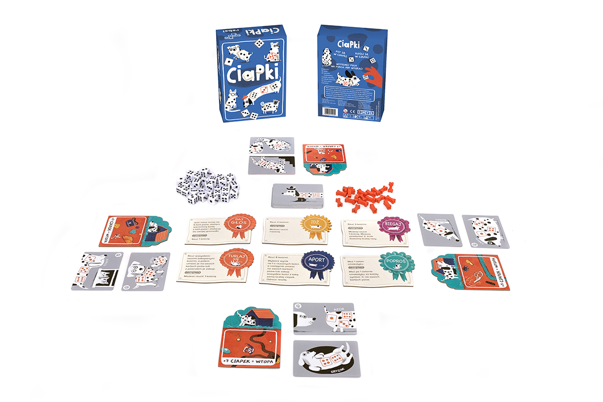 Ciapki to szybka gra opierająca się na zarządzaniu ryzykiem w celu skolekcjonowania sześciu kart łaciatych psiaków. Po rzuceniu kośćmi musimy dopasować wyniki do pól widniejących na pieskach. Kości, które nie pasują do naszych kart czworonogów zakopujemy w ogródku. Jeśli suma zakopanych ciapek przekroczy 7, tracimy wszystkie uzbierane kości. Duży stopień losowości i urocza oprawa sprawiają, że Ciapki są świetną grą nawet dla najmłodszych graczy.