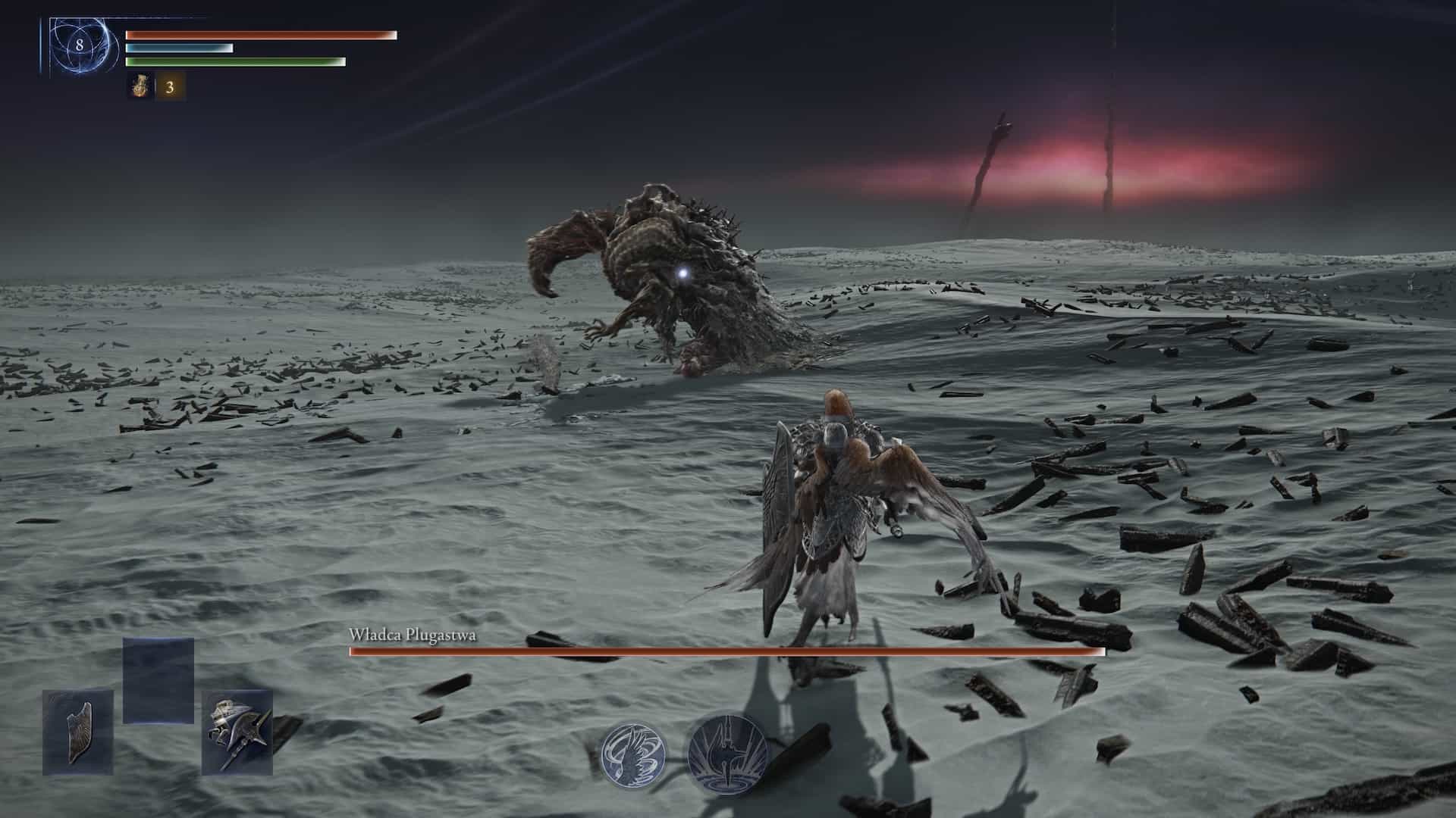 Drugim finalnym bossem jest Dreglord, który będzie wyzwaniem dla najbardziej wprawionych w boju graczy. Jego walka przypomniała mi mocno o Gaelu z Dark Souls 3, co jest skojarzeniem zdecydowanie na plus. Dreglord jest bowiem szalenie agresywny i wyprowadza nieustępliwe serie ataków, które nakładają na graczy najgorszy w grze status Scarlet Rot. Przeciwnik dodatkowo zaprasza do walki pomniejszych wrogów, których sam niszczy i tym samym wzmacnia swoje ciosy. Czasem wzmocnienie przekraczało nawet granicę absurdu i zbijało cały pasek zdrowia gracza jednym szybkim atakiem.