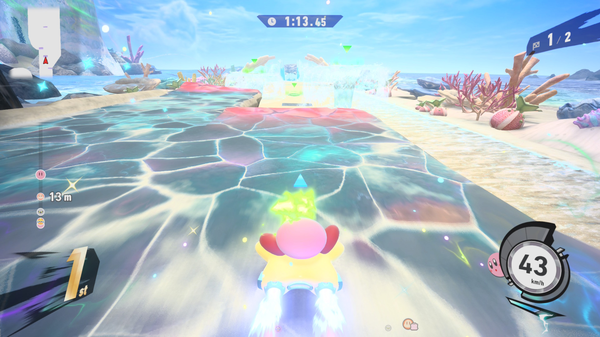 Istotą rozgrywki jest ściganie się pojazdami znanymi jako Air Ride Machines, na których zasiadają postacie z uniwersum Kirby’ego. To, co od razu odróżnia ten tytuł od typowych kart racerów, to brak bezpośredniej kontroli nad przyspieszeniem. Maszyna automatycznie utrzymuje stałą prędkość bazową, a rola gracza sprowadza się do sterowania, manewrowania i strategicznego wykorzystania mechanizmów zwiększających szybkość.