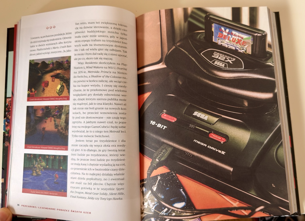 Na pochwałę zasługuje również samo wydanie książki. Przegrani prezentują się bardzo efektownie. Pełno tu wysokiej jakości zdjęć, ilustracji oraz screenów z gier. Elementy graficzne pojawiają się praktycznie na każdej stronie, przez co całość przypomina momentami elegancki magazyn growy. Tekst ułożony jest w dwóch kolumnach, co nie każdemu przypadnie do gustu i wymaga chwili przyzwyczajenia, ale jednocześnie dobrze współgra z wizualnym charakterem publikacji. Twarda oprawa dodatkowo podkreśla kolekcjonerski charakter książki, choć kontrowersyjny może być zabieg stylizacji okładki na zniszczoną. Zamysł jest zrozumiały, ale łatwo wyobrazić sobie czytelnika, który po otwarciu paczki z księgarni pomyśli, że otrzymał uszkodzony egzemplarz.
