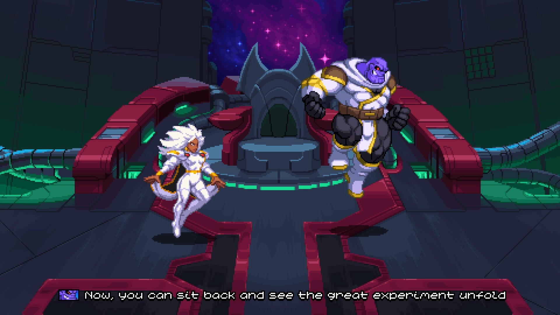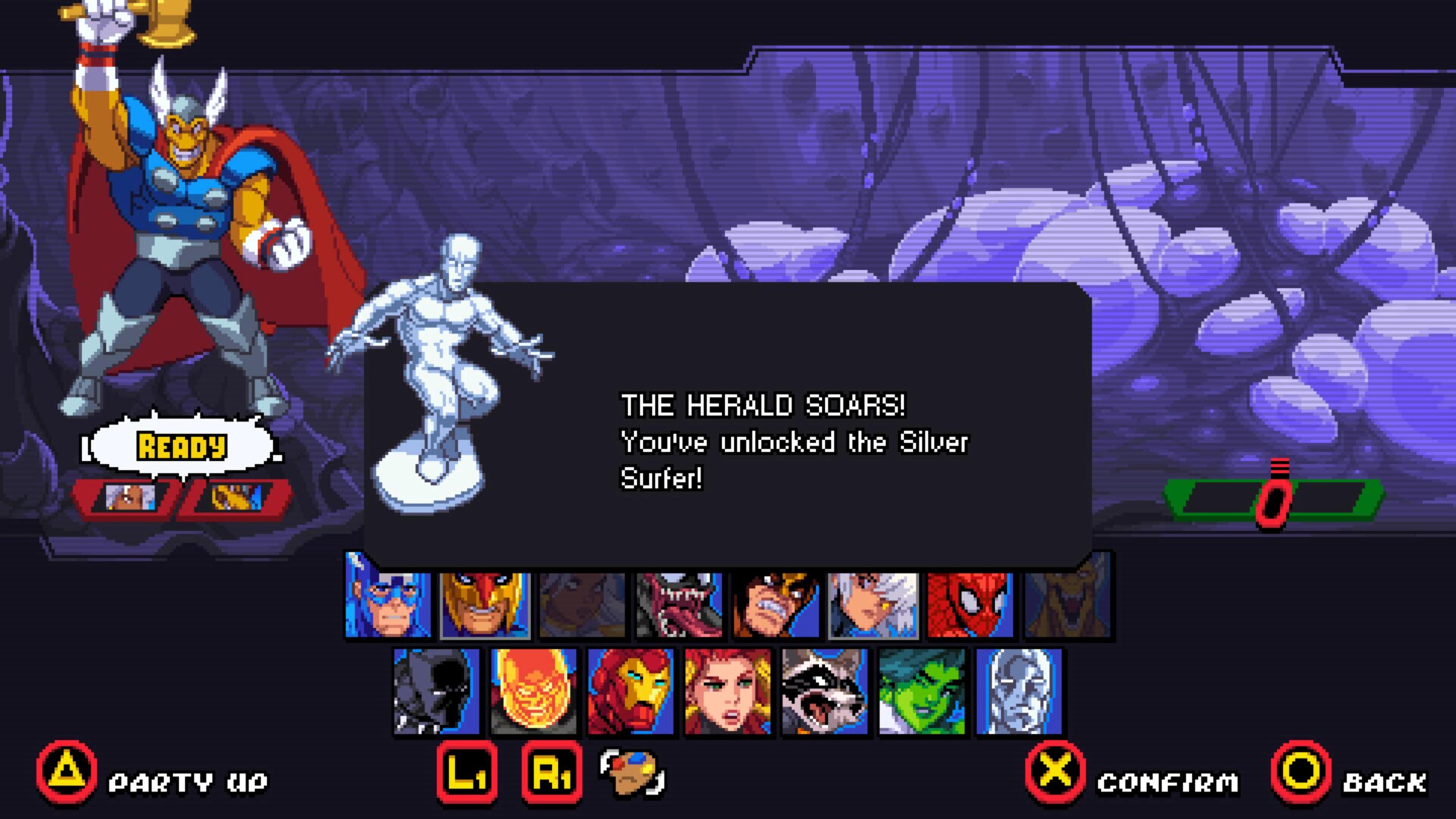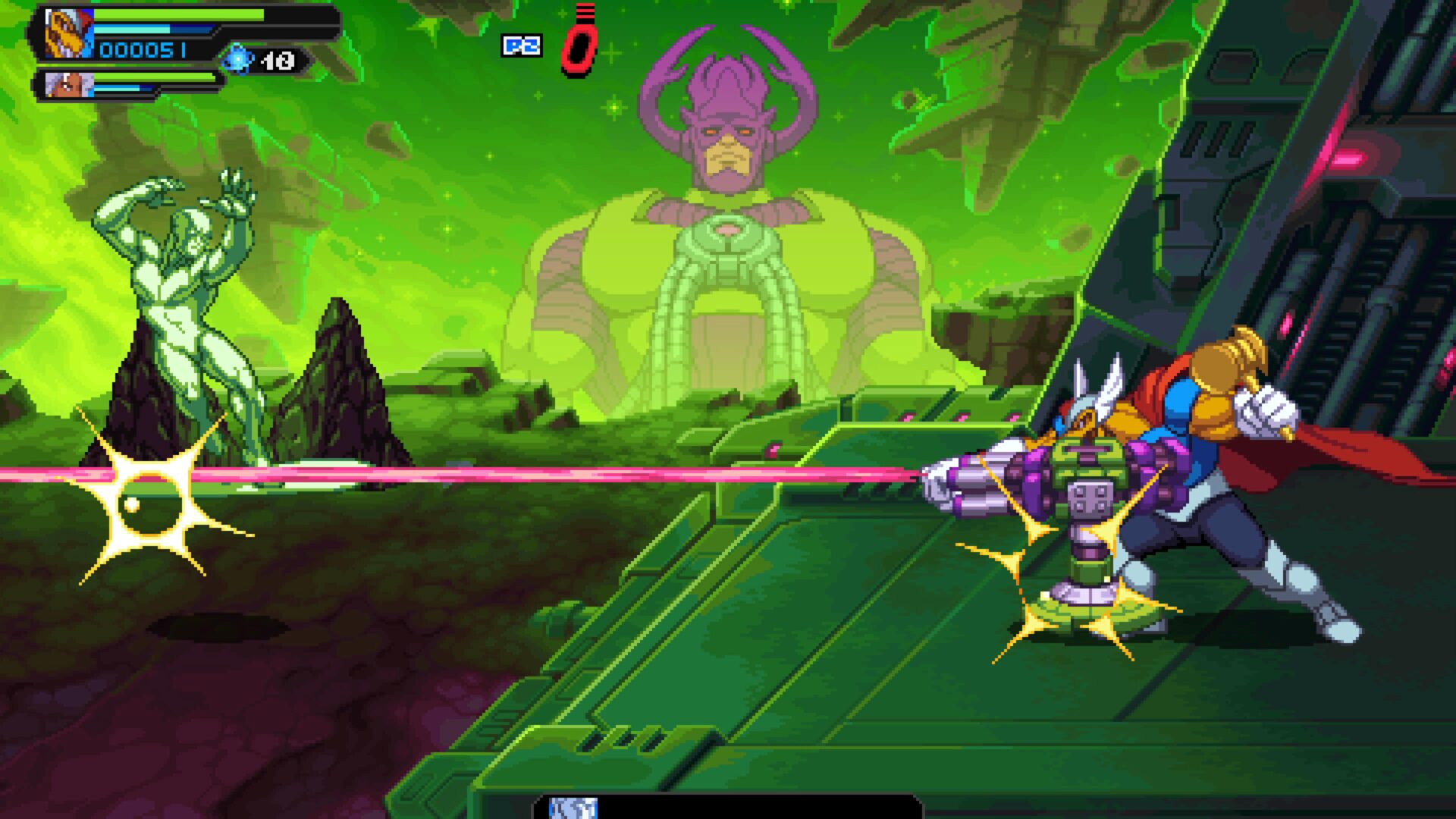 Gra natychmiast przyciąga wzrok. Pixel-art jest bogaty, pełen animacji, płynnych efektów cząsteczkowych i charakterystycznego stylu każdej postaci. Znani bohaterowie otrzymali sprite’y, które wyglądają jak żywcem wyciągnięte z komiksowych kart z lat 90., ale z precyzją, jakiej tamte czasy nie mogły zaoferować. Otoczenia są różnorodne, Nowy Jork, Xandar, Knowhere, Knull, kosmiczne pustkowia. Choć część poziomów to klasyczne „chodzone korytarze”, ich kolorystyka i detale potrafią wynagrodzić pewną powtarzalność.
