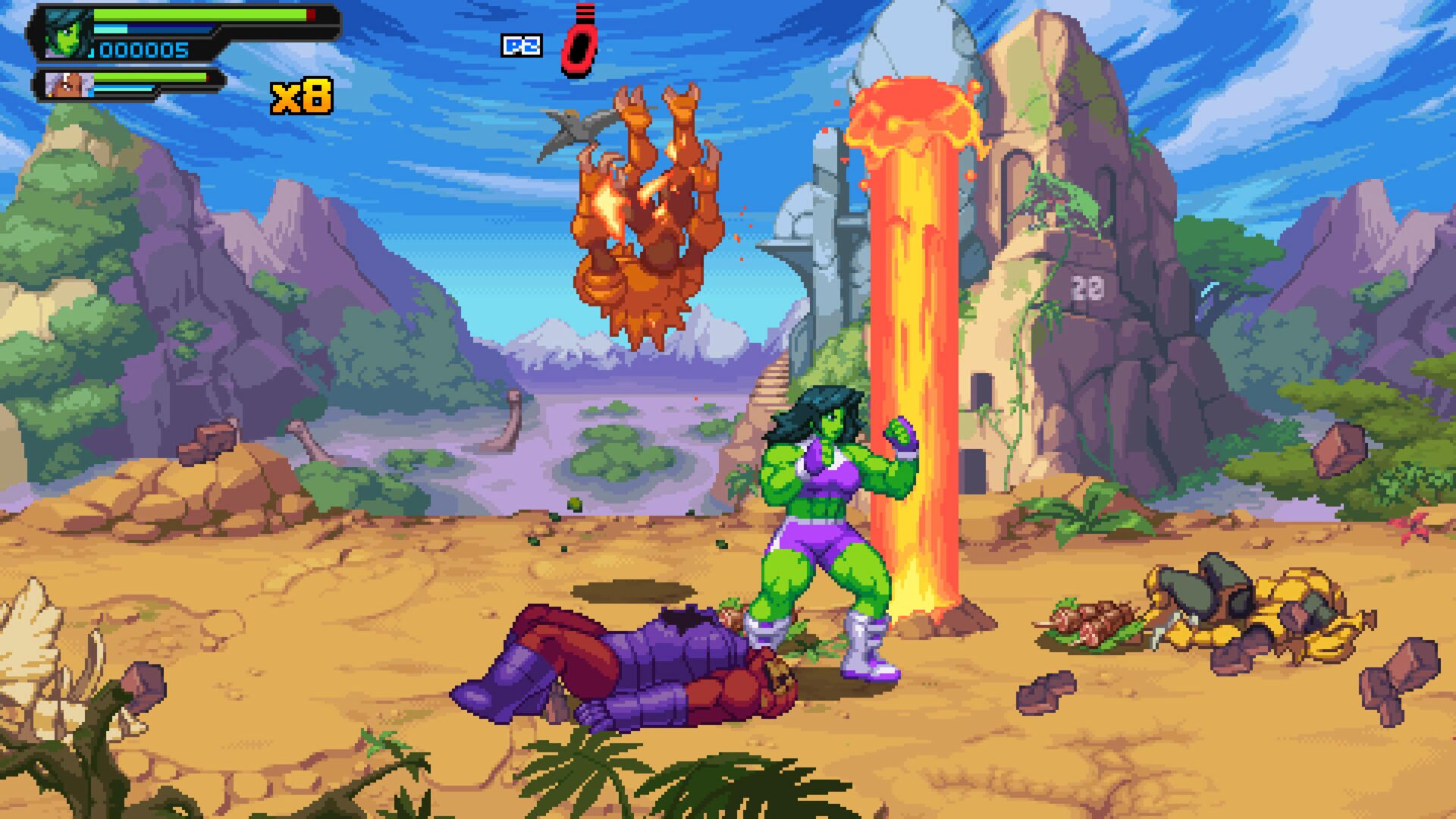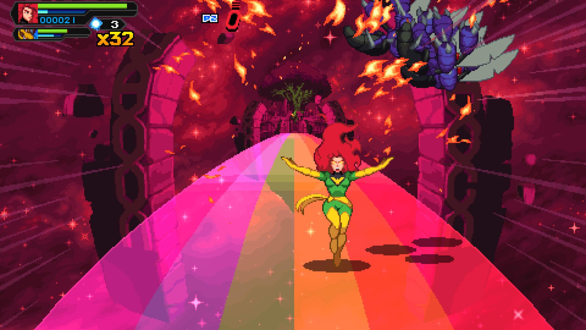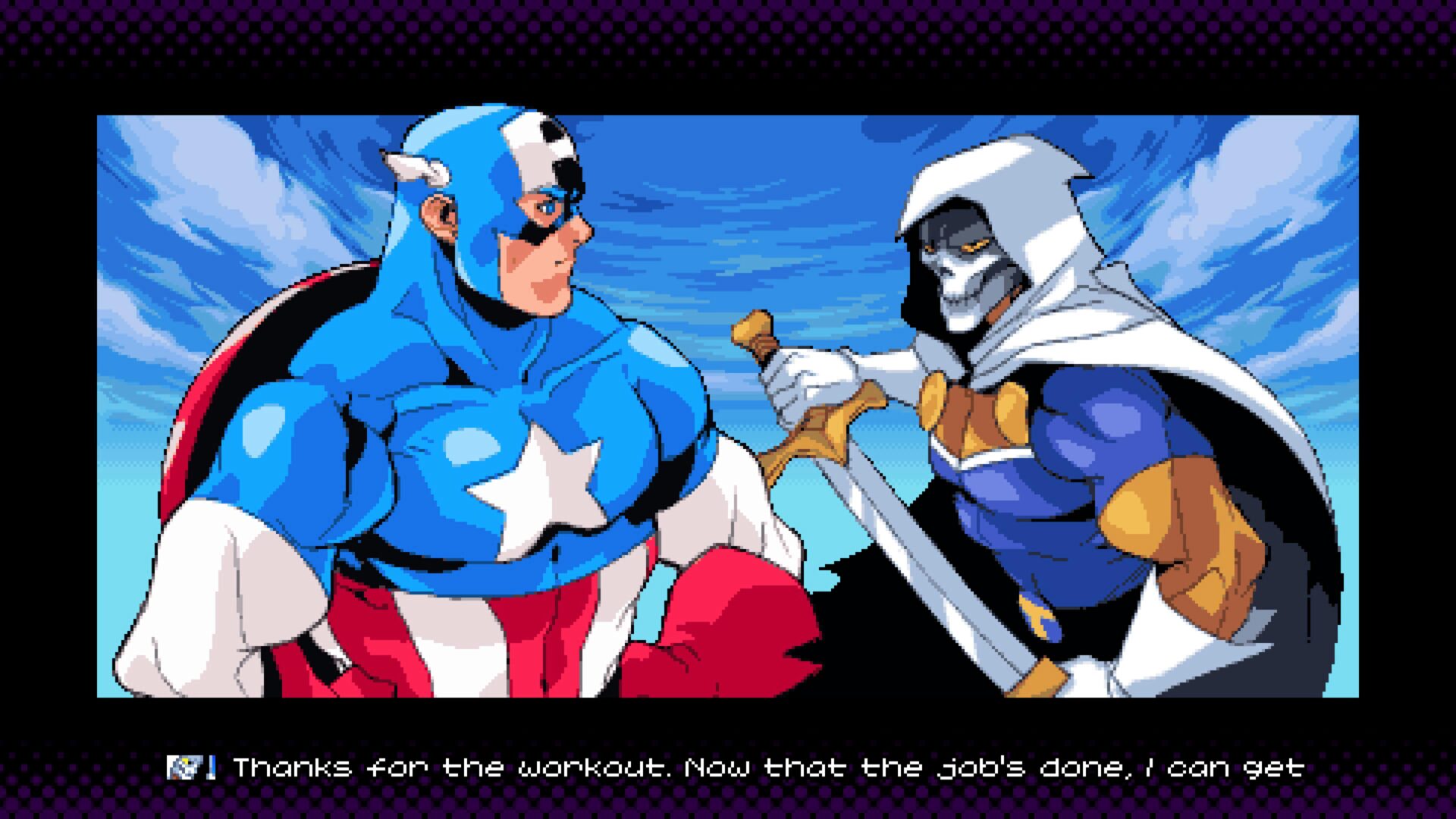Gra natychmiast przyciąga wzrok. Pixel-art jest bogaty, pełen animacji, płynnych efektów cząsteczkowych i charakterystycznego stylu każdej postaci. Znani bohaterowie otrzymali sprite’y, które wyglądają jak żywcem wyciągnięte z komiksowych kart z lat 90., ale z precyzją, jakiej tamte czasy nie mogły zaoferować. Otoczenia są różnorodne, Nowy Jork, Xandar, Knowhere, Knull, kosmiczne pustkowia. Choć część poziomów to klasyczne „chodzone korytarze”, ich kolorystyka i detale potrafią wynagrodzić pewną powtarzalność.