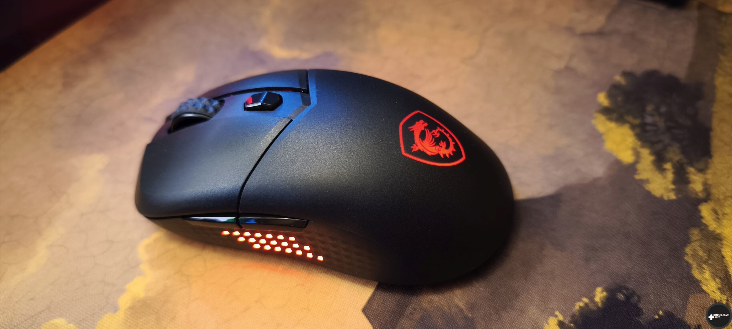Teoretycznie mogą z niej korzystać zarówno osoby praworęczne, jak i leworęczne. Należy jednak mieć świadomość, że w układzie leworęcznym uniemożliwiamy sobie dostęp do dwóch dodatkowych przycisków po lewej stronie myszki. Ja będę więc utrzymywać, że jest to myszka dla osób praworęcznych. Nie brakuje diody DPI oraz delikatnego podświetlenia RGB (o którym napiszę jeszcze w części poświęconej aplikacji MSI Center). Myszka od pierwszej chwili dobrze leży w dłoni i zaskakuje niewielką wagą. Wynosi ona zaledwie 65 gramów, co przekłada się na łatwe wykonywanie szybkich ruchów – jak znalazł do strzelanek.