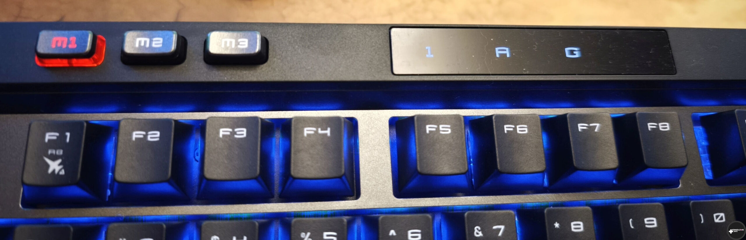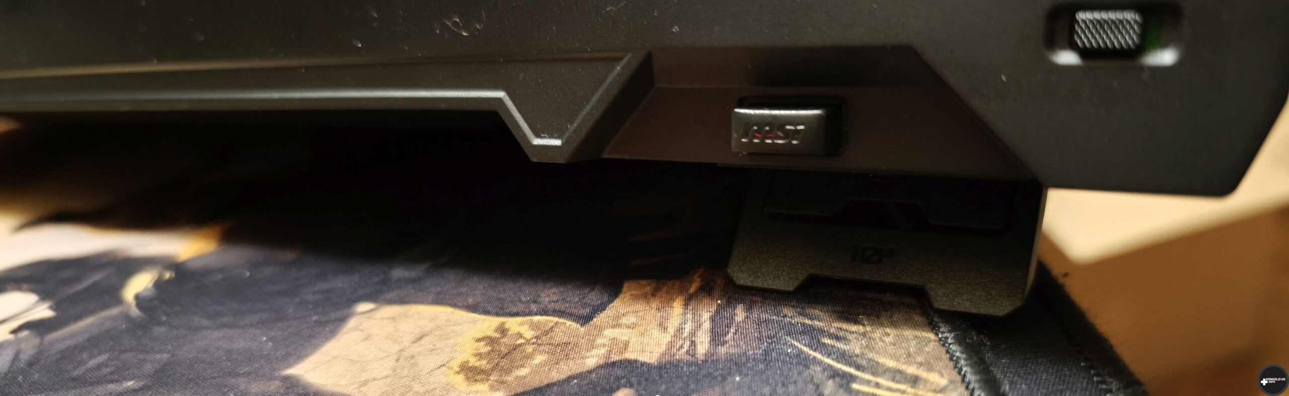 Warto jeszcze wspomnieć, że – jak widać na zdjęciach – klawiatura ma blok numeryczny, co zawsze doceniam w przypadku klawiatur i bardzo trudno jest mi korzystać z wariantów pozbawionych tego segmentu. Można go oczywiście wyłączyć, a o aktywacji lub jej braku informuje nas odpowiedni symbol na górnym wyświetlaczu. Znajdziemy tam też chociażby informację o wciśniętym przycisku Caps Lock, konieczności ładowania klawiatury, czy włączonym trybie dlagraczy. Wyłącza on skróty specjalne Windowsa. Zdecydowanie polecam włączanie tego trybu podczas grania – czy to w gry dla jednej osoby, czy w sieciowych zmaganiach. Oczywiście możemy zadecydować również o kącie nachylenia klawiatury za pomocą dwóch podpórek z tyłu. Klawiatura trzyma się na nich stabilnie nawet podczas intensywnych, wielogodzinnych sesji.